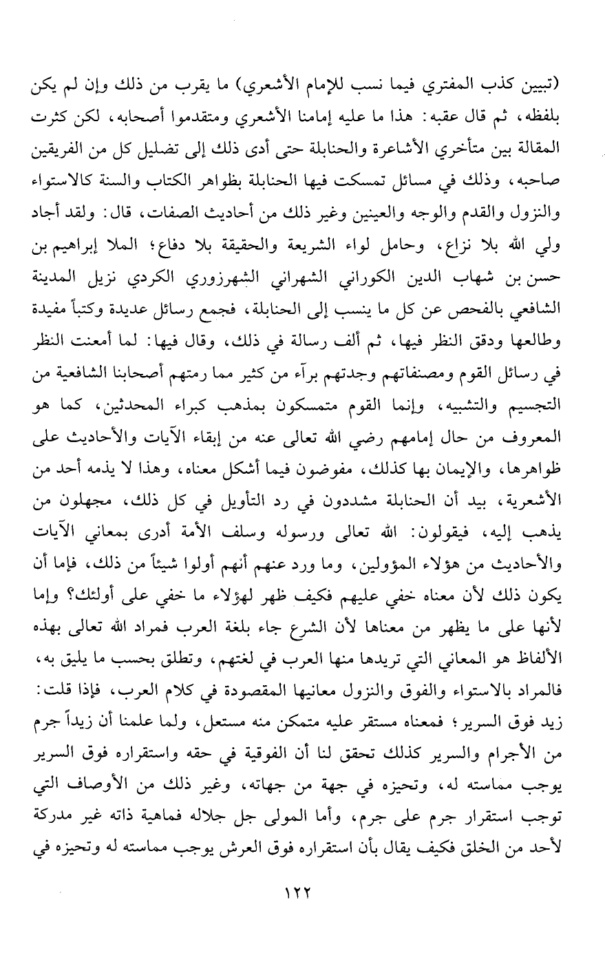 "تبيين كذب المفتري فيما نسب للإمام الأشعري" ما يقرب من ذلك وإن لم يكن بلفظه، ثم قال عقبه: هذا ما عليه إمامنا الأشعري ومتقدموا أصحابه، لكن كثرت المقالة بين متأخري الأشاعرة والحنابلة حتى أدى ذلك إلى تضليل كل من الفريقين صاحبه، وذلك في مسائل تمسكت فيها الحنابلة بظواهر الكتاب والسنة كالاستواء والنزول والقدم والوجه والعينين وغير ذلك من أحاديث الصفات، قال: ولقد أجاد ولي الله بلا نزاع، وحامل لواء الشريعة والحقيقة بلا دفاع؛ الملا إبراهيم بن حسن بن شهاب الدين الكوراني الشهراني الشهرزوري الكردي نزيل المدينة الشافعي بالفحص عن كل ما ينسب إلى الحنابلة، فجمع رسائل عديدة وكتباً مفيدة وطالعها ودقق النظر فيها، ثم ألف رسالة في ذلك، وقال فيها: لما أمعنت النظر في رسائل القوم ومصنفاتهم وجدتهم برآء من كثير مما رمتهم أصحابنا الشافعية من التجسيم والتشبيه، وإنما القوم متمسكون بمذهب كبراء المحدثين، كما هو المعروف من حال إمامهم رضي الله تعالى عنه من إبقاء الآيات والأحاديث على ظواهرها، والإيمان بها كذلك، مفوضون فيما أشكل معناه، وهذا لا يذمه أحد من الأشعرية، بيد أن الحنابلة مشددون في رد التأويل في كل ذلك، مجهلون من يذهب إليه، فيقولون: الله تعالى ورسوله وسلف الأمة أدرى بمعاني الآيات والأحاديث من هؤلاء المؤولين، وما ورد عنهم أنهم أولوا شيئاً من ذلك، فإما أن يكون ذلك لأن معناه خفي عليهم فكيف ظهر لهؤلاء ما خفي على أولئك؟ وإما لأنها على ما يظهر من معناها لأن الشرع جاء بلغة العرب فمراد الله تعالى بهذه الألفاظ هو المعاني التي تريدها منها العرب في لغتهم، وتطلق بحسب ما يليق به، فالمراد بالاستواء والفوق والنزول معانيها المقصودة في كلام العرب، فإذا قلت: زيد فوق السرير" فمعناه مستقر عليه متمكن منه مستعل، ولما علمنا أن زيداً جرم من الأجرام والسرير كذلك تحقق لنا أن الفوقية في حقه واستقراره فوق السرير يوجب مماسته له، وتحيزه في جهة من جهاته، وغير ذلك من الأوصاف التي توجب استقرار جرم على جرم، وأما المولى جل جلاله فماهية ذاته غير مدركة لأحد من الخلق فكيف يقال بأن استقراره فوق العرش يوجب مماسته له وتحيزه في