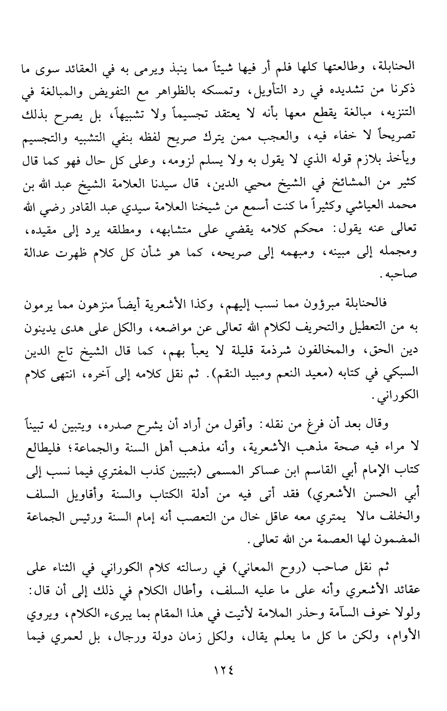 فالحنابلة مبرؤون مما نسب إليهم، وكذا الأشعرية أيضاً منزهون مما يرمون به من التعطيل والتحريف لكلام الله تعالى عن مواضعه، والكل على هدى يدينون دين الحق، والمخالفون شرذمة قليلة لا يعبأ بهم، كما قال الشيخ تاج الدين السبكي في كتابه "معيد النعم ومبيد النقم". ثم نقل كلامه إلى آخره، انتهى كلام الكوراني.