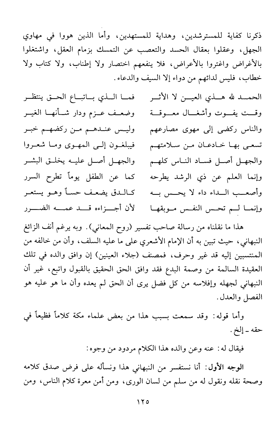 الوجه الأول: أنا نستفسر من النبهاني هذا ونسأله على فرض صدق كلامه وصحة نقله ونقول له من سلم من لسان الورى، ومن أمن معرة كلام الناس، ومن
