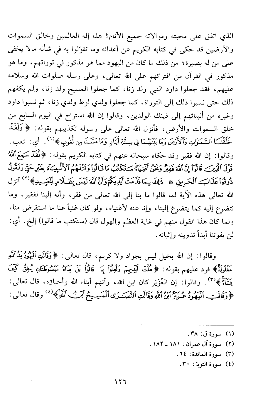 الذي اتفق على محبته وموالاته جميع الأنام؟ هذا إله العالمين وخالق السموات والأرضين قد حكى في كتابه الكريم عن أعدائه وما تقوّلوا به في شأنه مالا يخفى على من له بصيرة؛ من ذلك ما كان من اليهود مما هو مذكور في توراتهم، وما هو مذكور في القرآن من افترائهم على الله تعالى، وعلى رسله صلوات الله وسلامه عليهم، فقد جعلوا داود النبي ولد زنا، كما جعلوا المسيح ولد زنا، ولم يكفهم ذلك حتى نسبوا ذلك إلى التوراة، كما جعلوا ولدي لوط ولدي زنا، ثم نسبوا داود وغيره من أنبيائهم إلى ذينك الولدين، وقالوا إن الله استراح في اليوم السابع من خلق السموات والأرض، فأنزل الله تعالى على رسوله تكذيبهم بقوله: {وَلَقَدْ خَلَقْنَا السَّمَاوَاتِ وَالْأَرْضَ وَمَا بَيْنَهُمَا فِي سِتَّةِ أَيَّامٍ وَمَا مَسَّنَا مِنْ لُغُوبٍ} 1. أي: تعب. وقالوا: إن الله فقير وقد حكاه سبحانه عنهم في كتابه الكريم بقوله: {لَقَدْ سَمِعَ اللَّهُ قَوْلَ الَّذِينَ قَالُوا إِنَّ اللَّهَ فَقِيرٌ وَنَحْنُ أَغْنِيَاءُ سَنَكْتُبُ مَا قَالُوا وَقَتْلَهُمُ الْأَنْبِيَاءَ بِغَيْرِ حَقٍّ وَنَقُولُ ذُوقُوا عَذَابَ الْحَرِيقِ * ذَلِكَ بِمَا قَدَّمَتْ أَيْدِيكُمْ وَأَنَّ اللَّهَ لَيْسَ بِظَلَّامٍ لِلْعَبِيدِ} 2 أنزل الله تعالى هذه الآية لما قالوا ما بنا إلى الله تعالى من فقر، وأنه إلينا لفقير، وما نتضرع إليه كما يتضرع إلينا، وإنا عنه لأغنياء، ولو كان غنياً عنا ما استقرض منا، ولما كان هذا القول منهم في غاية العظم والهول قال "سنكتب قالوا" إلخ. أي: لن يفوتنا أبداً تدوينه وإثباته.