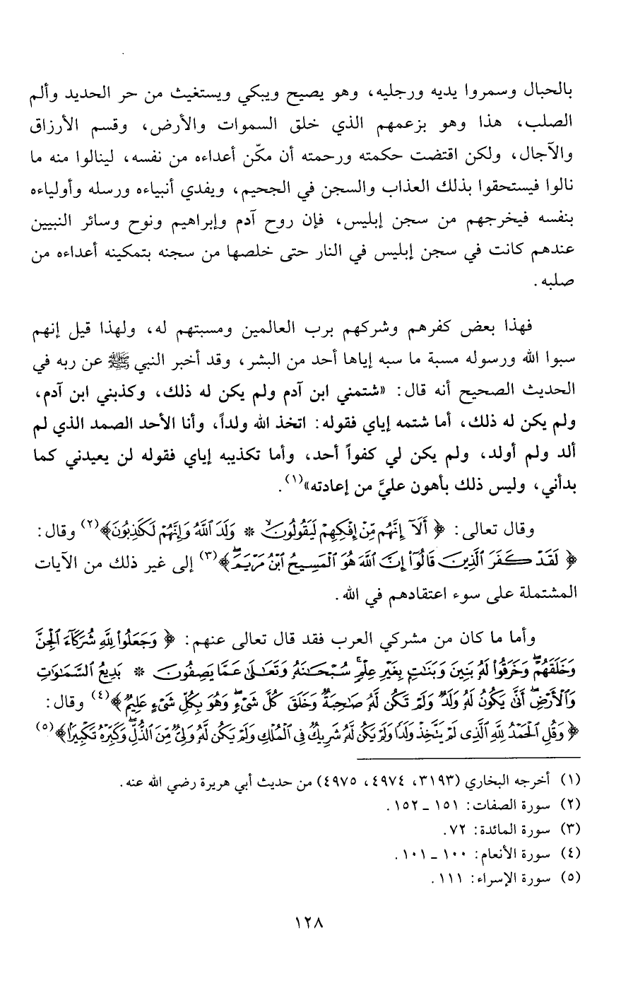 فهذا بعض كفرهم وشركهم برب العالمين ومسبتهم له، ولهذا قيل إنهم سبوا االله ورسوله مسبة ما سبه إياها أحد من البشر، وقد أخبر النبي صلى الله عليه وسلم عن ربه في الحديث الصحيح أنه قال: "شتمني ابن آدم ولم يكن له ذلك، وكذبني ابن آدم، ولم يكن له ذلك، أما شتمه إياي فقوله: اتخذ الله ولداً، وأنا الأحد الصمد الذي لم ألد ولم أولد، ولم يكن لي كفواً أحد، وأما تكذيبه إياي فقوله لن يعيدني كما بدأني، وليس ذلك بأهون عليَّ من إعادته"1.