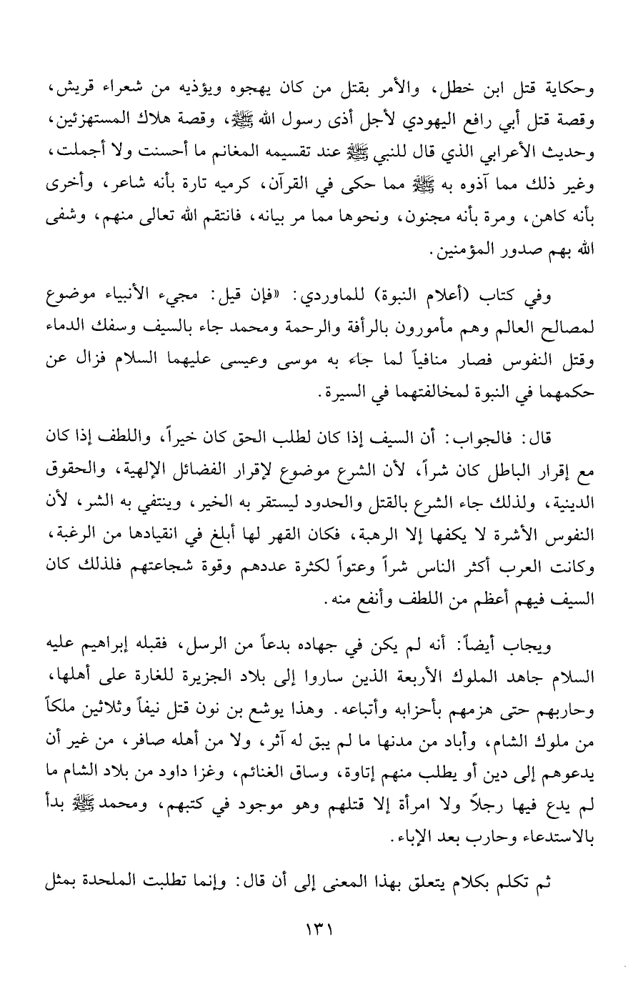 قال: فالجواب: أن السيف إذا كان لطلب الحق كان خيراً، واللطف إذا كان مع إقرار الباطل كان شراً، لأن الشرع موضوع لإقرار الفضائل الإلهية، والحقوق الدينية، ولذلك جاء الشرع بالقتل والحدود ليستقر به الخير، وينتفي به الشر، لأن النفوس الأشرة لا يكفها إلا الرهبة، فكان القهر لها أبلغ في انقيادها من الرغبة، وكانت العرب أكثر الناس شراً وعتواً لكثرة عددهم وقوة شجاعتهم فلذلك كان السيف فيهم أعظم من اللطف وأنفع منه.