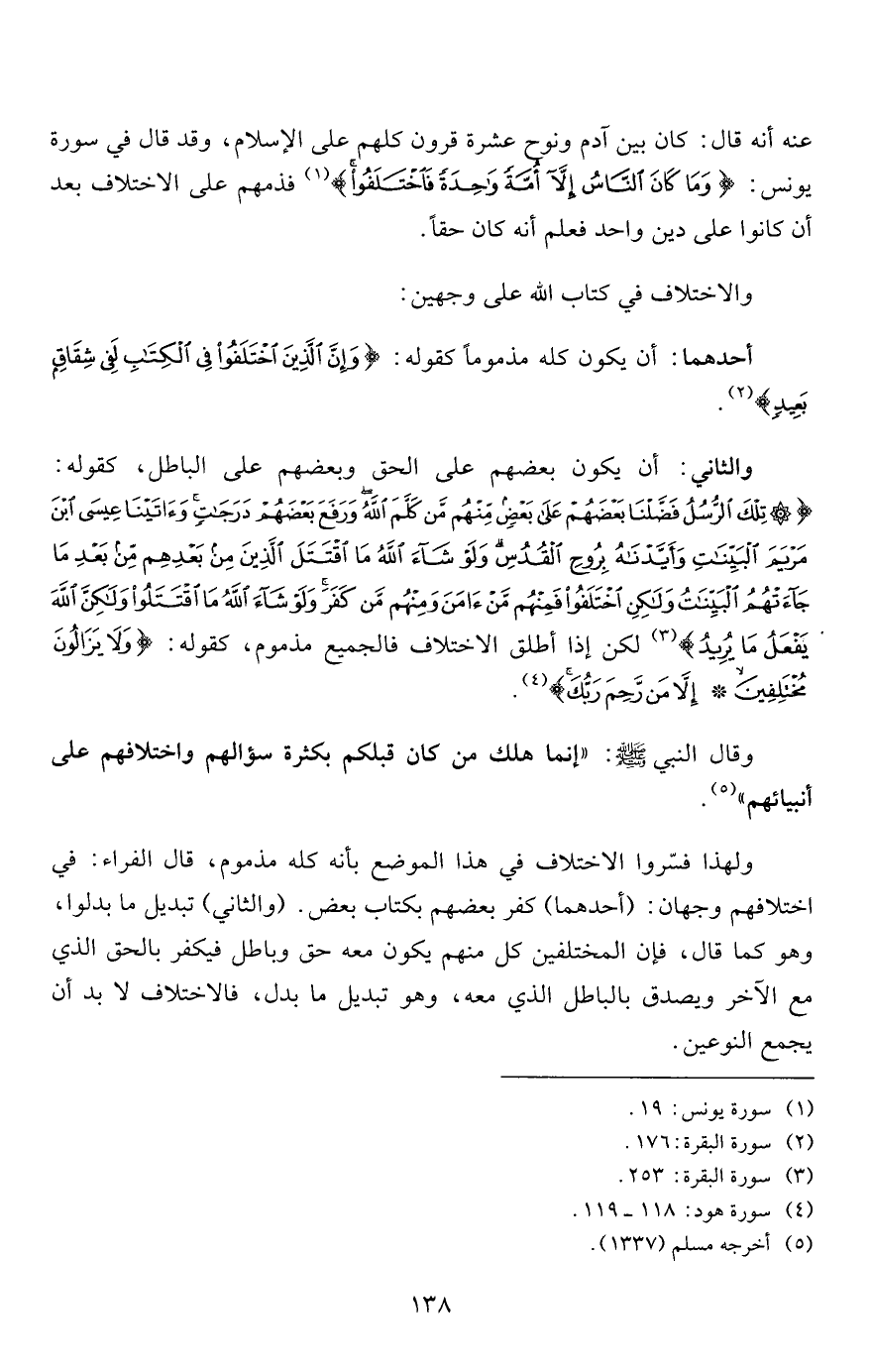 والثاني: أن يكون بعضهم على الحق وبعضهم على الباطل، كقوله {تِلْكَ الرُّسُلُ فَضَّلْنَا بَعْضَهُمْ عَلَى بَعْضٍ مِنْهُمْ مَنْ كَلَّمَ اللَّهُ وَرَفَعَ بَعْضَهُمْ دَرَجَاتٍ وَآتَيْنَا عِيسَى ابْنَ مَرْيَمَ الْبَيِّنَاتِ وَأَيَّدْنَاهُ بِرُوحِ الْقُدُسِ وَلَوْ شَاءَ اللَّهُ مَا اقْتَتَلَ الَّذِينَ مِنْ بَعْدِهِمْ مِنْ بَعْدِ مَا جَاءَتْهُمُ الْبَيِّنَاتُ وَلَكِنِ اخْتَلَفُوا فَمِنْهُمْ مَنْ آمَنَ وَمِنْهُمْ مَنْ كَفَرَ وَلَوْ شَاءَ اللَّهُ مَا اقْتَتَلُوا وَلَكِنَّ اللَّهَ يَفْعَلُ مَا يُرِيدُ} 3 لكن إذا أطلق الاختلاف فالجميع مذموم، كقوله {وَلا يَزَالُونَ مُخْتَلِفِينَ * إِلَّا مَنْ رَحِمَ رَبُّكَ} 4.