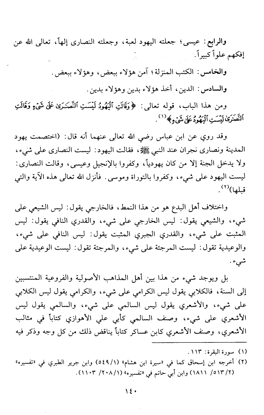 ومن هذا الباب، قوله تعالى: {وَقَالَتِ الْيَهُودُ لَيْسَتِ النَّصَارَى عَلَى شَيْءٍ وَقَالَتِ النَّصَارَى لَيْسَتِ الْيَهُودُ عَلَى شَيْءٍ} 1.