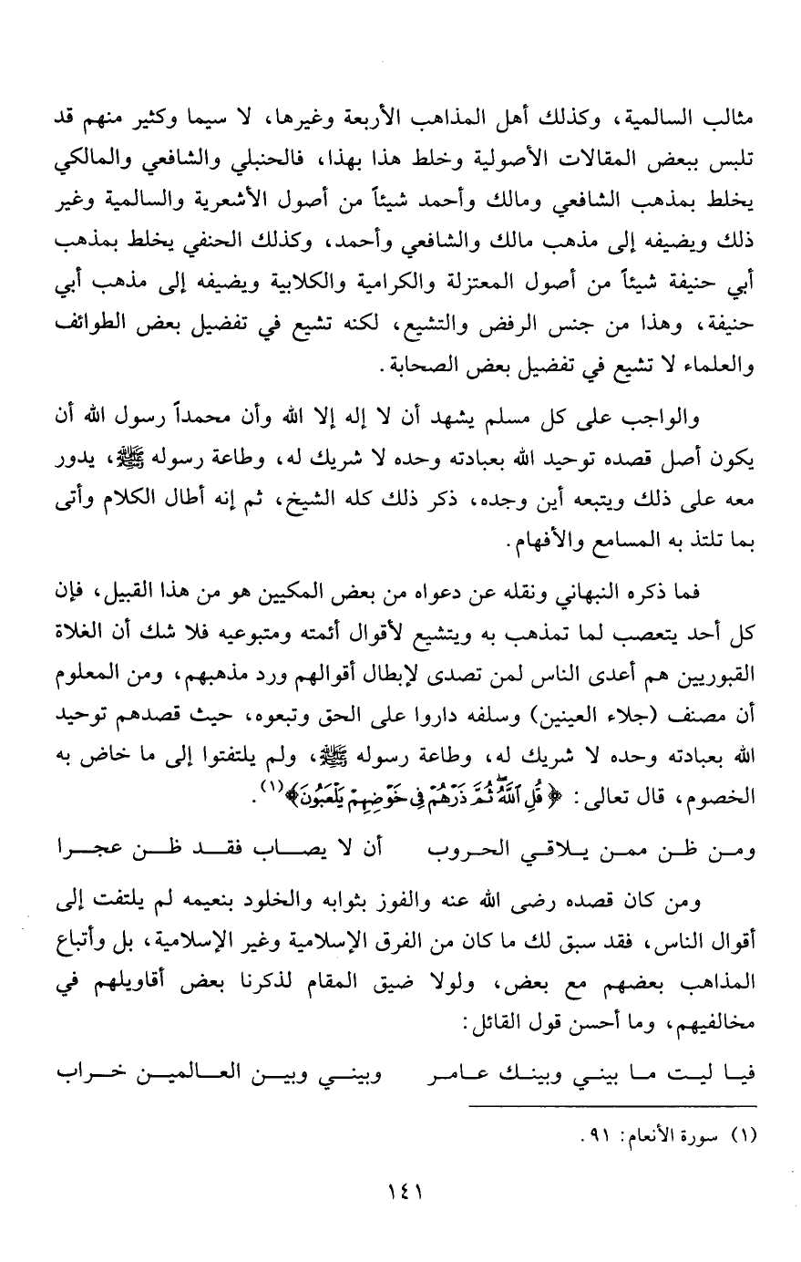 فما ذكره النبهاني ونقله عن دعواه من بعض المكيين هو من هذا القبيل، فإن كل أحد يتعصب لما تمذهب به ويتشيع لأقوال أئمته ومتبوعيه فلا شك أن الغلاة القبوريين هم أعدى الناس لمن تصدى لإبطال أقوالهم ورد مذهبهم، ومن المعلوم أن مصنف "جلاء العينين" وسلفه داروا على الحق وتبعوه، حيث قصدهم توحيد الله بعبادته وحده لا شريك له، وطاعة رسوله صلى الله عليه وسلم، ولم يلتفتوا إلى ما خاض به الخصوم، قال تعالى: {قُلِ اللَّهُ ثُمَّ ذَرْهُمْ فِي خَوْضِهِمْ يَلْعَبُونَ} 1.