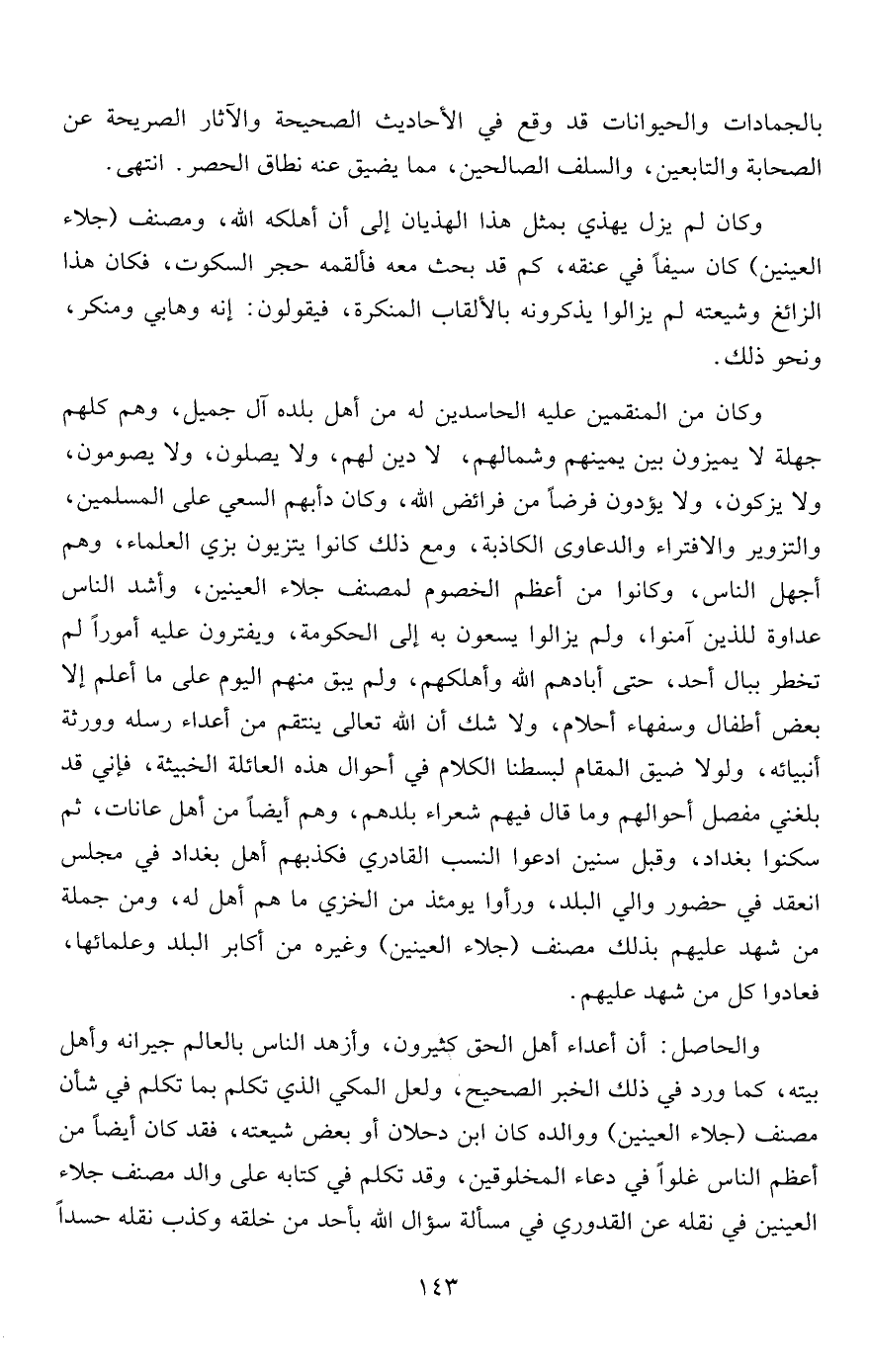 والحاصل: أن أعداء أهل الحق كثيرون، وأزهد الناس بالعالم جيرانه وأهل بيته، كما ورد في ذلك الخبر الصحيح، ولعل المكي الذي تكلم بما تكلم في شأن مصنف "جلاء العينين" ووالده كان ابن دحلان أو بعض شيعته، فقد كان أيضاً من أعظم الناس غلواً في دعاء المخلوقين، وقد تكلم في كتابه على والد مصنف جلاء العينين في نقله عن القدوري في مسألة سؤال الله بأحد من خلقه وكذب نقله حسداً