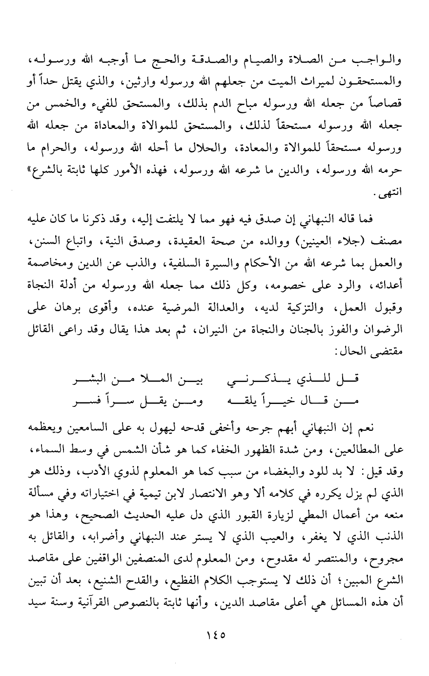 نعم إن النبهاني أبهم جرحه وأخفى قدحه ليهول به على السامعين ويعظمه على المطالعين، ومن شدة الظهور الخفاء كما هو شأن الشمس في وسط السماء، وقد قيل: لا بد للود والبغضاء من سبب كما هو المعلوم لذوي الأدب،. وذلك هو الذي لم يزل يكرره في كلامه ألا وهو الانتصار لابن تيمية في اختياراته وفي مسألة منعه من أعمال المطي لزيارة القبور الذي دل عليه الحديث الصحيح، وهذا هو الذنب الذي لا يغفر، والعيب الذي لا يستر عند النبهاني وأضرابه، والقائل به مجروح، والمنتصر له مقدوح، ومن المعلوم لدى المنصفين الواقفين على مقاصد الشرع المبين؛ أن ذلك لا يستوجب الكلام الفظيع، والقدح الشنيع، بعد أن تبين أن هذه المسائل هي أعلى مقاصد الدين، وأنها ثابتة بالنصوص القرآنية وسنة سيد