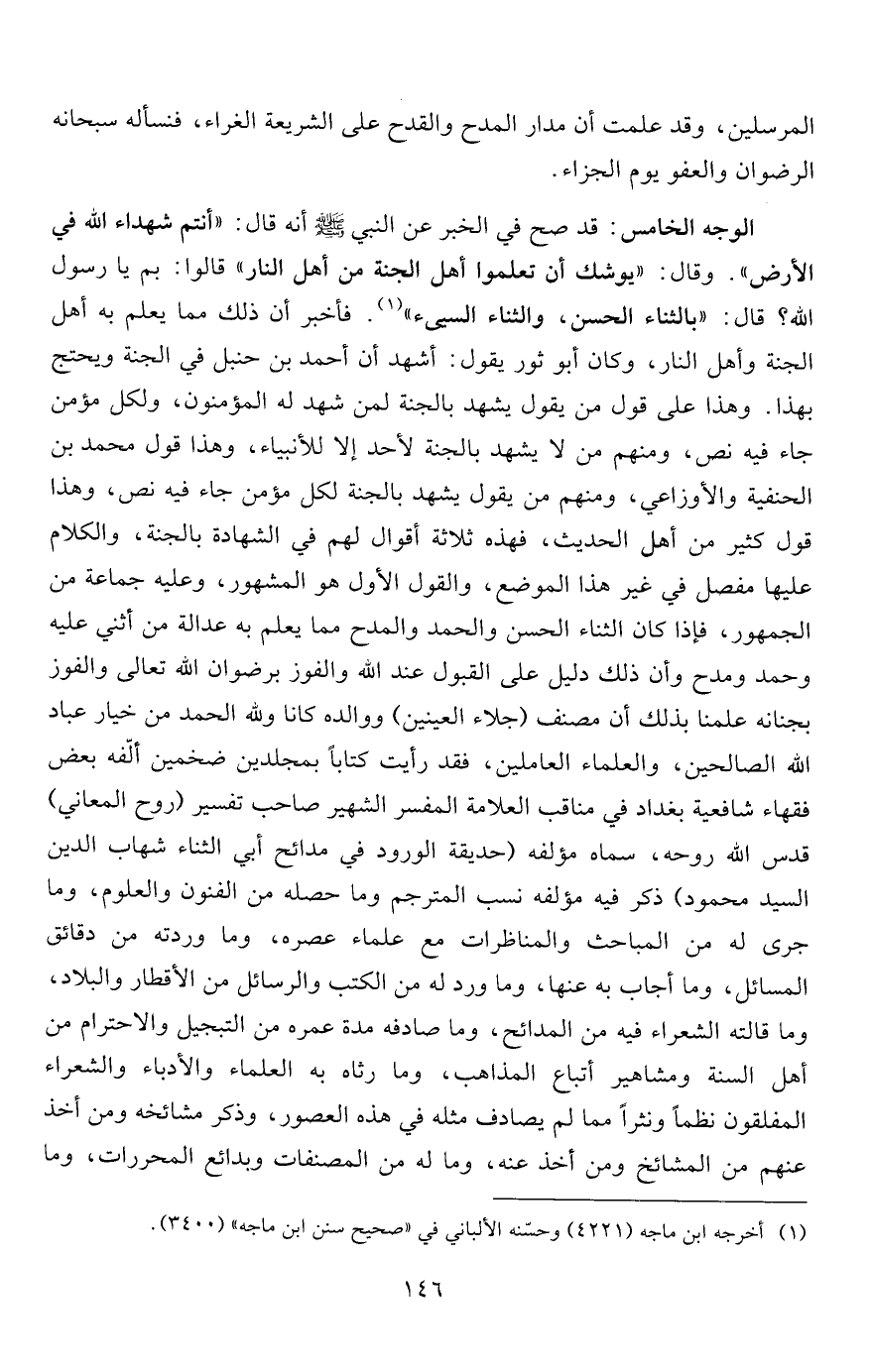 الوجه الخامس: قد صح في الخبر عن النبي صلى الله عليه وسلم أنه قال: "أنتم شهداء الله في الأرض ". وقال: "يوشك أن تعلموا أهل الجنة من أهل النار" قالوا: بم يا رسول الله؟ قال: "بالثناء الحسن، والثناء السيىء" 1. فأخبر أن ذلك مما يعلم به أهل الجنة وأهل النار، وكان أبو ثور يقول: أشهد أن أحمد بن حنبل في الجنة ويحتج بهذا. وهذا على قول من يقول يشهد بالجنة لمن شهد له المؤمنون، ولكل مؤمن جاء فيه نص، ومنهم من لا يشهد بالجنة لأحد إلا للأنبياء، وهذا قول محمد بن الحنفية والأوزاعي، ومنهم من يقول يشهد بالجنة لكل مؤمن جاء فيه نص، وهذا قول كثير من أهل الحديث، فهذه ثلاثة أقوال لهم في الشهادة بالجنة، والكلام عليها مفصل في غير هذا الموضع، والقول الأول هو المشهور، وعليه جماعة من الجمهور، فإذا كان الثناء الحسن والحمد والمدح مما يعلم به عدالة من أثني عليه وحمد ومدح وأن ذلك دليل على القبول عند الله والفوز برضوان الله تعالى والفوز بجنانه علمنا بذلك أن مصنف "جلاء العينين" ووالده كانا ولله الحمد من خيار عباد الله الصالحين، والعلماء العاملين، فقد رأيت كتاباً بمجلدين ضخمين ألّفه بعض فقهاء شافعية بغداد في مناقب العلامة المفسر الشهير صاحب تفسير "روح المعاني" قدس الله روحه، سماه مؤلفه "حديقة الورود في مدائح أبي الثناء شهاب الدين السيد محمود" ذكر فيه مؤلفه نسب المترجم وما حصله من الفنون والعلوم، وما جرى له من المباحث والمناظرات مع علماء عصره، وما وردته من دقائق المسائل، وما أجاب به عنها، وما ورد له من الكتب والرسائل من الأقطار والبلاد، وما قالته الشعراء فيه من المدائح، وما صادفه مدة عمره من التبجيل والاحترام من أهل السنة ومشاهير أتباع المذاهب، وما رثاه به العلماء والأدباء والشعراء المفلقون نظماً ونثراً مما لم يصادف مثله في هذه العصور، وذكر مشائخه ومن أخذ عنهم من المشائخ ومن أخذ عنه، وما له من المصنفات وبدائع المحررات، وما