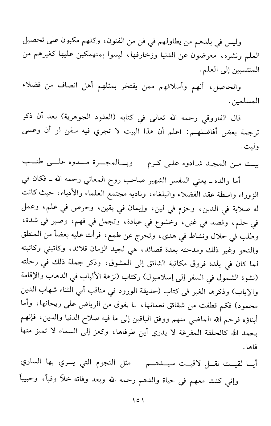 أما والده- يعني المفسر الشهير صاحب روح المعاني رحمه الله- فكان في الزوراء واسطة عقد الفضلاء والبلغاء، وناديه مجتمع العلماء والأدباء، حيث كانت له صلابة في الدين، وحزم في لين، وإيمان في يقين، وحرص في علم، وعمل في حلم، وقصد في غنى، وخشوع في عبادة، وتجمل في فهم، وصبر في شدة، وطلب في حلال ونشاط في هدى، وتحرج عن طمع، قرأت عليه بعضاً من المنطق والنحو وغير ذلك ومدحته بعدة قصائد، هي لجيد الزمان قلائد، وكاتبني وكاتبته لما كان في بلدة فروق مكاتبة الشائق إلى المشوق، وذكر جملة ذلك في رحلته "نشوة الشمول في السفر إلى إسلامبول" وكتاب "تزهة الألباب في الذهاب والإقامة والإياب" وذكرها الغير في كتاب "حديقة الورود في مناقب أبي الثناء شهاب الدين محمود" فكم قطفت من شقائق نعمانها، ما يفوق من الرياض على ريحانها، وأما أبناؤه فرحم الله الماضي منهم ووفق الباقين إلى ما فيه صلاح الدنيا والدين، فإنهم بحمد الله كالحلقة المفرغة لا يدري أين طرفاها، وكعز إلى السماء لا تميز منها فاها.