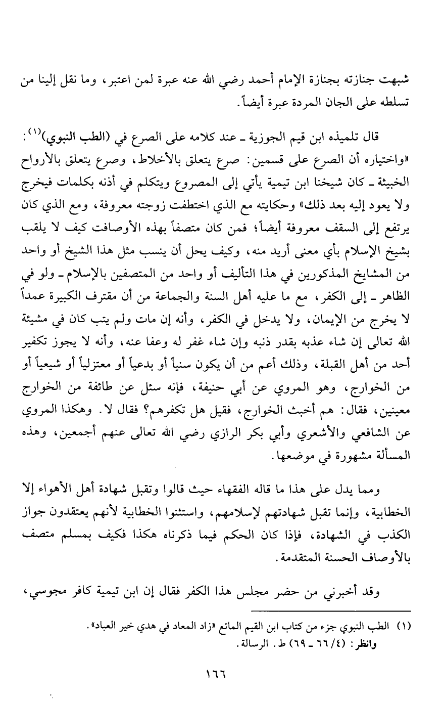 قال تلميذه ابن قيم الجوزية- عند كلامه على الصرع في "الطب النبوي" 1: "واختياره أن الصرع على قسمين: صرع يتعلق بالأخلاط، وصرع يتعلق بالأرواح الخبيثة- كان شيخنا ابن تيمية يأتي إلى المصروع ويتكلم في أذنه بكلمات فيخرج ولا يعود إليه بعد ذلك " وحكايته مع الذي اختطفت زوجته معروفة، ومع الذي كان يرتفع إلى السقف معروفة أيضاً؛ فمن كان متصفاً بهذه الأوصافت كيف لا يلقب بشيخ الإسلام بأي معنى أريد منه، وكيف يحل أن ينسب مثل هذا الشيخ أو واحد من المشايخ المذكورين في هذا التأليف أو واحد من المتصفين بالإسلام- ولو في الظاهر- إلى الكفر، مع ما عليه أهل السنة والجماعة من أن مقترف الكبيرة عمداً لا يخرج من الإيمان، ولا يدخل في الكفر، وأنه إن مات ولم يتب كان في مشيئة الله تعالى إن شاء عذبه بقدر ذنبه وإن شاء غفر له وعفا عنه، وأنه لا يجوز تكفير أحد من أهل القبلة، وذلك أعم من أن يكون سنياً أو بدعياً أو معتزلياً أو شيعياً أو من الخوارج، وهو المروي عن أبي حنيفة، فإنه سئل عن طائفة من الخوارج معينين، فقال: هم أخبث الخوارج، فقيل هل تكفرهم؟ فقال لا. وهكذا المروي عن الشافعي والأشعري وأبي بكر الرازي رضي الله تعالى عنهم أجمعين، وهذه المسألة مشهورة في موضعها.