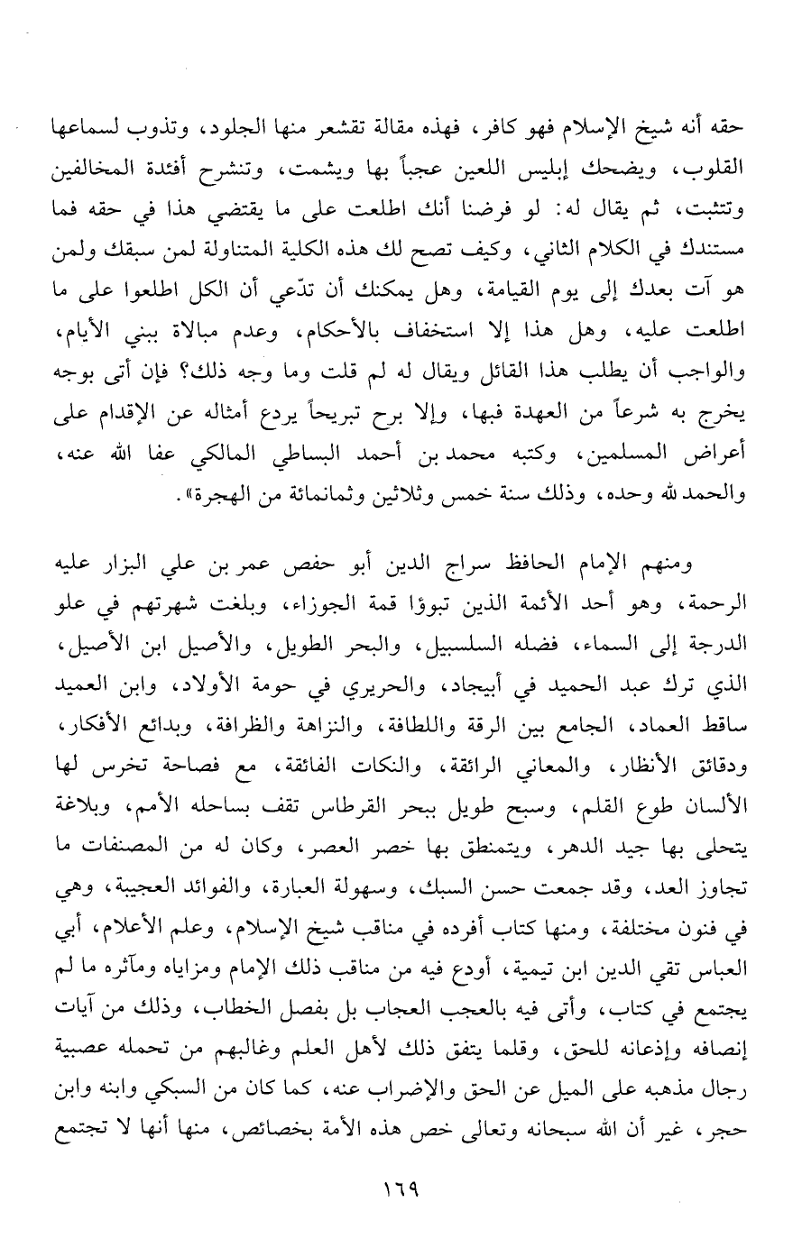 ومنهم الإمام الحافظ سراج الدين أبو حفص عمر بن علي البزار عليه الرحمة، وهو أحد الأئمة الذين تبوؤا قمة الجوزاء، وبلغت شهرتهم في علو الدرجة إلى السماء، فضله السلسبيل، والبحر الطويل، والأصيل ابن الأصيل، الذي ترك عبد الحميد في أبيجاد، والحريري في حومة الأولاد، وابن العميد ساقط العماد، الجامع بين الرقة واللطافة، والنزاهة والظرافة، وبدائع الأفكار، ودقائق الأنظار، والمعاني الرائقة، والنكات الفائقة، مع فصاحة تخرس لها الألسان طوع القلم، وسبح طويل ببحر القرطاس تقف بساحله الأمم، وبلاغة يتحلى بها جيد الدهر، ويتمنطق بها خصر العصر، وكان له من المصنفات ما تجاوز العد، وقد جمعت حسن السبك، وسهولة العبارة، والفوائد العجيبة، وهي في فنون مختلفة، ومنها كتاب أفرده في مناقب شيخ الإسلام، وعلم الأعلام، أبي العباس تقي الدين ابن تيمية، أودع فيه من مناقب ذلك الإمام ومزاياه ومآثره ما لم يجتمع في كتاب، وأتى فيه بالعجب العجاب بل بفصل الخطاب، وذلك من آيات إنصافه وإذعانه للحق، وقلما يتفق ذلك لأهل العلم وغالبهم من تحمله عصبية رجال مذهبه على الميل عن الحق والإضراب عنه، كما كان من السبكي وابنه وابن حجر، غير أن الله سبحانه وتعالى خص هذه الأمة بخصائص، منها أنها لا تجتمع