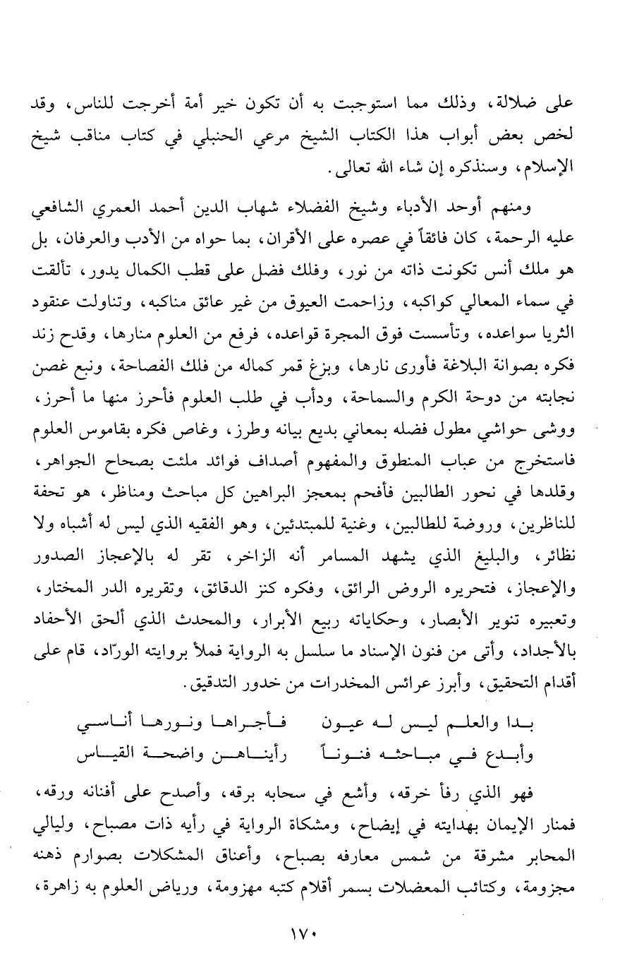 ومنهم أوحد الأدباء وشيخ الفضلاء شهاب الدين أحمد العمري الشافعي عليه الرحمة، كان فائقاً في عصره على الأقران، بما حواه من الأدب والعرفان، بل هو ملك أنس تكونت ذاته من نور، وفلك فضل على قطب الكمال يدور، تألقت في سماء المعالي كواكبه وزاحمت العيوق من غير عائق مناكبه في وتناولت عنقود الثريا سواعده، وتأسست فوق المجرة قواعده، فرفع من العلوم منارها، وقدح زند فكره بصوانة البلاغة فأورى نارها، وبزغ قمر كماله من فلك الفصاحة، ونبع غصن نجابته من دوحة الكرم والسماحة، ودأب في طلب العلوم فأحرز منها ما أحرز، ووشى حواشي مطول فضله بمعاني بديع بيانه وطرز، وغاص فكره بقاموس العلوم فاستخرج من عباب المنطوق والمفهوم أصداف فوائد ملئت بصحاح الجواهر، وقلدها في نحور الطالبين فأفحم بمعجز البراهين كل مباحث ومناظر، هو تحفة للناظرين، وروضة للطالبين وغنية للمبتدئين، وهو الفقيه الذي ليس له أشباه ولا نظائر، والبليغ الذي يشهد المسامر أنه الزاخر، تقر له بالإعجاز الصدور والإعجاز، فتحريره الروض الرائق، وفكره كنز الدقائق، وتقريره الدر المختار، وتعبيره تنوير الأبصار، وحكاياته ربيع الأبرار، والمحدث الذي ألحق الأحفاد بالأجداد، وأتى من فنون الإسناد ما سلسل به الرواية فملأ بروايته الورّاد، قام على أقدام التحقيق، وأبرز عرائس المخدرات من خدور التدقيق.