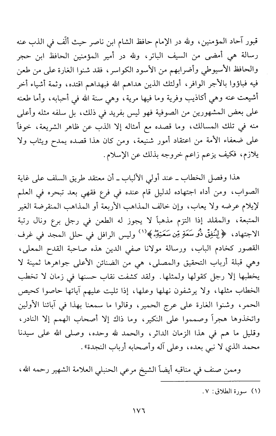 هذا وفصل الخطاب- عند أولي الألباب- أن معتقد طريق السلف على غاية الصواب، ومن أداه اجتهاده لدليل قام عنده في فرع فقهي بعد تبحره في العلم لإيلام عرضه ولا يعاب، وإن خالف المذاهب الأربعة أو المذاهب المنقرضة الغير المتبعة، والمقلد إذا التزم مذهباً لا يجوز له الطعن في رجل برع ونال رتبة الاجتهاد {لِيُنْفِقْ ذُو سَعَةٍ مِنْ سَعَتِهِ} 1 وليس الرافل في حلل المجد في غرف القصور كخادم الباب، ورسالة مولانا صفي الدين هذه صاحبة القدح المعلى، وهي قبلة أرباب التحقيق والمصلى، هي من الضنائن الأعلى جواهرها ثمينة لا يخطبها إلا رجل كقولها ولمثلها. ولقد كشفت نقاب حسنها في زمان لا تخطب الخطاب مثلها، ولا يرشفون نهلها وعلها، إذا تليت عليهم آياتها حاصوا كحيص الحمر، وشنوا الغارة على عرج الحمير، وقالوا ما سمعنا بهذا في آبائنا الأولين واتخذوها هجراً وصمموا على النكير، وما ذاك إلا أصحاب الهمم إلا النادر، وقليل ما هم في هذا الزمان الداثر، والحمد لله وحده، وصلى الله على سيدنا محمد الذي لا نبي بعده، وعلى آله وأصحابه أرباب النجدة".