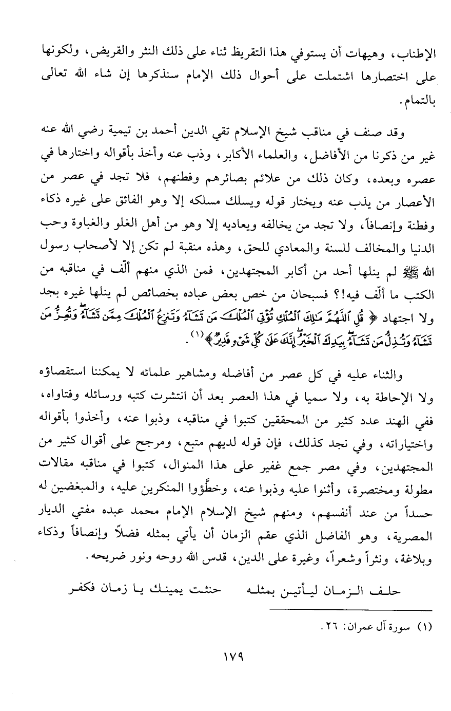 وقد صنف في مناقب شيخ الإسلام تقي الدين أحمد بن تيمية رضي الله عنه غير من ذكرنا من الأفاضل، والعلماء الأكابر، وذب عنه وأخذ بأقواله واختارها في عصره وبعده، وكان ذلك من علائم بصائرهم وفطنهم، فلا تجد في عصر من الأعصار من يذب عنه ويختار قوله ويسلك مسلكه إلا وهو الفائق على غيره ذكاء وفطنة وإنصافاً، ولا تجد من يخالفه ويعاديه إلا وهو من أهل الغلو والغباوة وحب الدنيا والمخالف للسنة والمعادي للحق، وهذه منقبة لم تكن إلا لأصحاب رسول الله صلى الله عليه وسلم لم ينلها أحد من أكابر المجتهدين، فمن الذي منهم ألّف في مناقبه من الكتب ما ألّف فيه!؟ فسبحان من خص بعض عباده بخصائص لم ينلها غيره بجد ولا اجتهاد {قُلِ اللَّهُمَّ مَالِكَ الْمُلْكِ تُؤْتِي الْمُلْكَ مَنْ تَشَاءُ وَتَنْزِعُ الْمُلْكَ مِمَّنْ تَشَاءُ وَتُعِزُّ مَنْ تَشَاءُ وَتُذِلُّ مَنْ تَشَاءُ بِيَدِكَ الْخَيْرُ إِنَّكَ عَلَى كُلِّ شَيْءٍ قَدِيرٌ} 1.