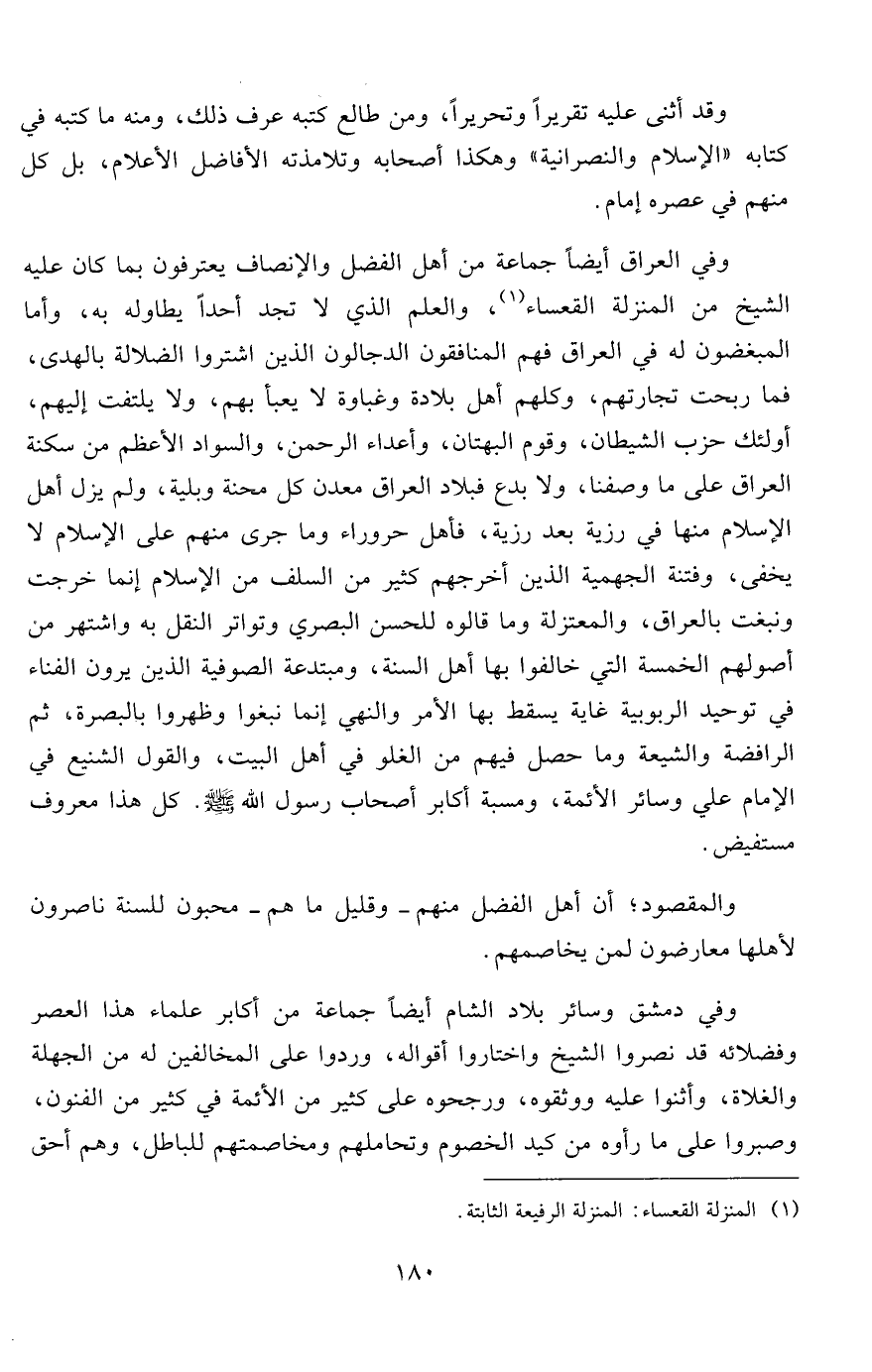 وفي العراق أيضاً جماعة من أهل الفضل والإنصاف يعترفون بما كان عليه الشيخ من المنزلة القعساء1، والعلم الذي لا تجد أحداً يطاوله به، وأما المبغضون له في العراق فهم المنافقون الدجالون الذين اشتروا الضلالة بالهدى، فما ربحت تجارتهم، وكلهم أهل بلادة وغباوة لا يعبأ بهم، ولا يلتفت إليهم، أولئك حزب الشيطان، وقوم البهتان، وأعداء الرحمن، والسواد الأعظم من سكنة العراق على ما وصفنا، ولا بدع فبلاد العراق معدن كل محنة وبلية، ولم يزل أهل الإسلام منها في رزية بعد رزية، فأهل حروراء وما جرى منهم على الإسلام لا يخفى، وفتنة الجهمية الذين أخرجهم كثير من السلف من الإسلام إنما خرجت ونبغت بالعراق، والمعتزلة وما قالوه للحسن البصري وتواتر النقل به واشتهر من أصولهم الخمسة التي خالفوا بها أهل السنة، ومبتدعة الصوفية الذين يرون الفناء في توحيد الربوبية غاية يسقط بها الأمر والنهي إنما نبغوا وظهروا بالبصرة، ثم الرافضة والشيعة وما حصل فيهم من الغلو في أهل البيت، والقول الشنيع في: الإمام علي وسائر الأئمة، ومسبة أكابر أصحاب رسول الله صلى الله عليه وسلم. كل هذا معروف مستفيض.