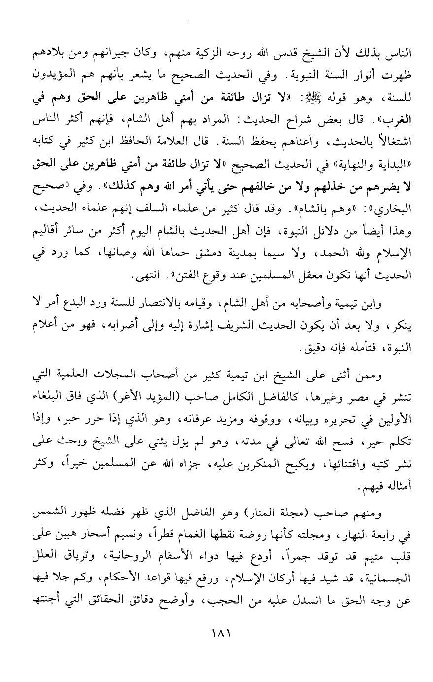 وابن تيمية وأصحابه من أهل الشام، وقيامه بالانتصار للسنة ورد البدع أمر لا ينكر، ولا بعد أن يكون الحديث الشريف إشارة إليه وإلى أضرابه، فهو من أعلام النبوة، فتأمله فإنه دقيق.