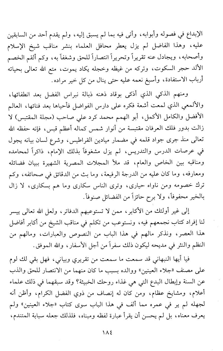 فيا أيها النبهاني قد سمعت ما سمعت من تقريري وبياني فهل بقي لك لوم، على مصنف "جلاء العينين" ووالده بسبب ما كان منهما من الانتصار للحق والذب عن السنة وإبطال البدع التي هي غذاء روحك الخبيثة؟ وقد سبقهما في ذلك علماء أعلام، ومشايخ عظام، ومن كان له إنصاف من ذوي الفضل الكرام، وأظن أنه لجهله لم ير في عمره مما ألف في هذا الباب سوى كتاب "جلاء العينين" ولم يعرف معناه، بل لم يحسن أن يقرأ عبارة لفظه ومبناه، فلذلك جعله سبابة المتندم،