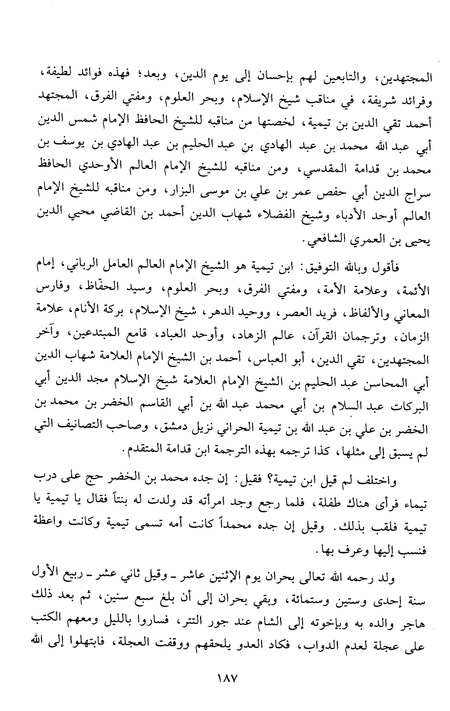 فأقول وبالله التوفيق: ابن تيمية هو الشيخ الإمام العالم العامل الرباني، إمام الأئمة، وعلامة الأمة، ومفتي الفرق، وبحر العلوم، وسيد الحفّاظ، وفارس المعاني والألفاظ، فريد العصر، ووحيد الدهر، شيخ الإسلام، بركة الأنام، علامة الزمان، وترجمان القرآن، عالم الزهاد، وأوحد العباد، قامع المبتدعين، وآخر المجتهدين، تقي الدين، أبو العباس، أحمد بن الشيخ الإمام العلامة شهاب الدين أبي المحاسن عبد الحليم بن الشيخ الإمام العلامة شيخ الإسلام مجد الدين أبي البركات عبد السلام بن أبي محمد عبد الله بن أبي القاسم الخضر بن محمد بن الخضز بن علي بن عبد الله بن تيمية الحراني نزيل دمشق، وصاحب التصانيف التي لم يسبق إلى مثلها، كذا ترجمه بهذه الترجمة ابن قدامة المتقدم.