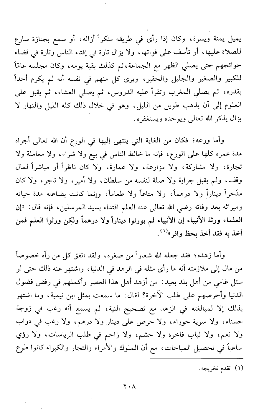 وأما ورعه؛ فكان من الغاية التي ينتهى إليها في الورع أن الله تعالى أجراه مدة عمره كلها على الورع، فإنه ما خالط الناس في بيع ولا شراء، ولا معاملة ولا تجارة، ولا مشاركة، ولا مزارعة، ولا عمارة، ولا كان ناظراً أو مباشراً لمال وقف، ولم يقبل جراية ولا صلة لنفسه من سلطان، ولا أمير، ولا تاجر، ولا كان مدّخراً ديناراً ولا درهماً، ولا متاعاً ولا طعاماً، وإنما كانت بضاعته مدة حياته وميراثه بعد وفاته رضي الله تعالى عنه العلم اقتداء بسيد المرسلين، فإنه قال: "إن العلماء ورثة الأنبياء إن الأنبياء لم يورثوا ديناراً ولا درهماً ولكن ورثوا العلم فمن أخذ به فقد أخذ بحظ وافر"1.