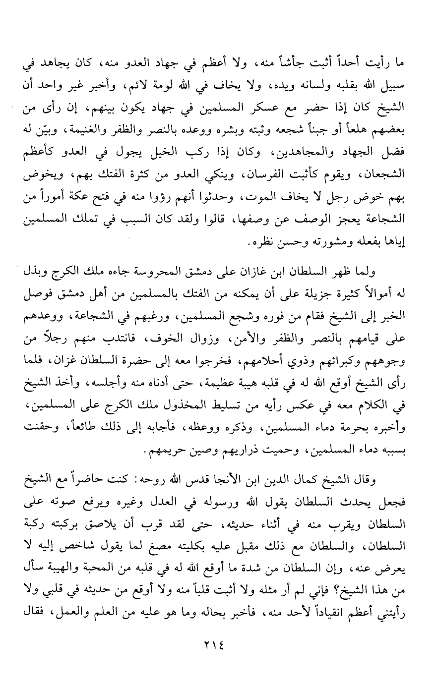 وقال الشيخ كمال الدين ابن الأنجا قدس الله روحه: كنت حاضراً مع الشيخ فجعل يحدث السلطان بقول الله ورسوله في العدل وغيره ويرفع صوته على السلطان ويقرب منه في أثناء حديثه، حتى لقد قرب أن يلاصق بركبته ركبة السلطان، والسلطان مع ذلك مقبل عليه بكليته مصغ لما يقول شاخص إليه لا يعرض عنه، وإن السلطان من شدة ما أوقع الله له في قلبه من المحبة والهيبة سأل من هذا الشيخ؟ فإني لم أر مثله ولا أثبت قلباً منه ولا أوقع من حديثه في قلبي ولا رأيتني أعظم انقياداً لأحد منه، فأخبر بحاله وما هو عليه من العلم والعمل، فقال