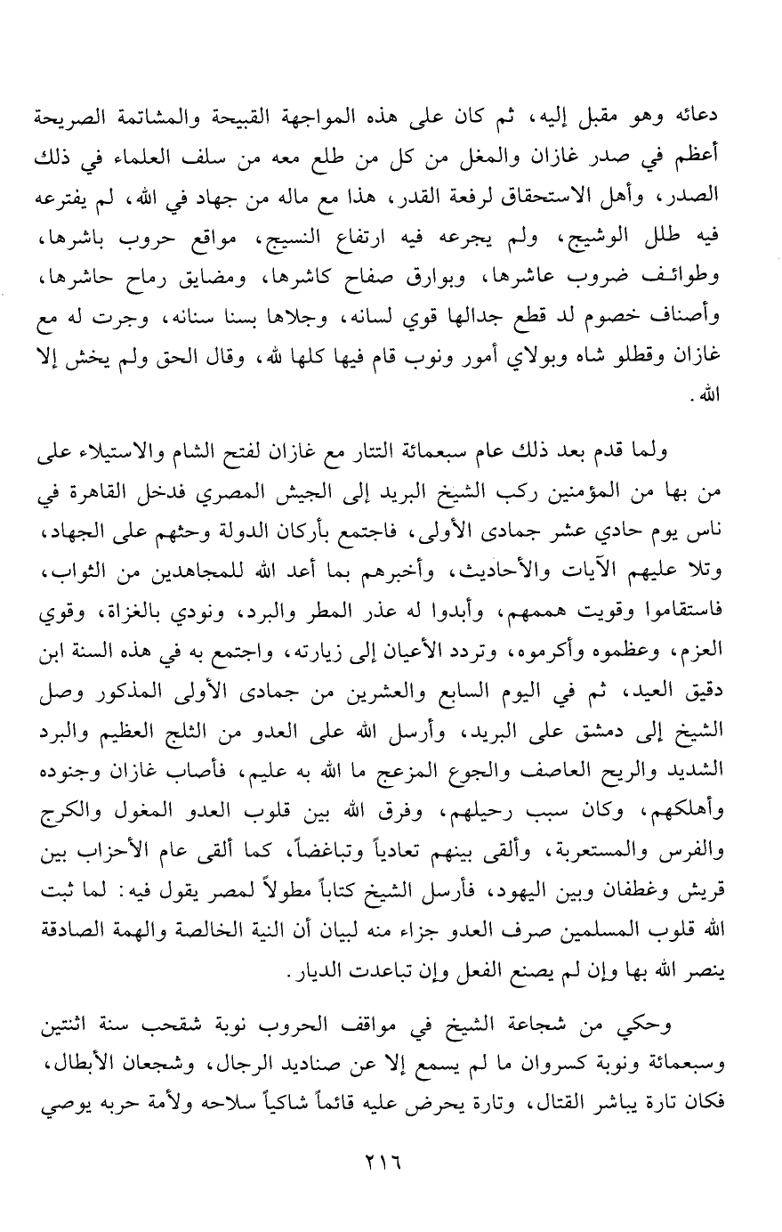 دعائه وهو مقبل إليه، ثم كان على هذه المواجهة القبيحة والمشاتمة الصريحة أعظم في صدر غازان والمغل من كل من طلع معه من سلف العلماء في ذلك الصدر، وأهل الاستحقاق لرفعة القدر، هذا مع ماله من جهاد في الله، لم يفترعه فيه طلل الوشيج، ولم يجرعه فيه ارتفاع النسيج، مواقع حروب باشرها، وطوائف ضروب عاشرها، وبوارق صفاح كاشرها، ومضايق رماح حاشرها، وأصناف خصوم لد قطع جدالها قوي لسانه، وجلاها بسنا سنانه، وجرت له مع غازان وقطلو شاه وبولاي أمور ونوب قام فيها كلها لله، وقال الحق ولم يخش إلا الله.
