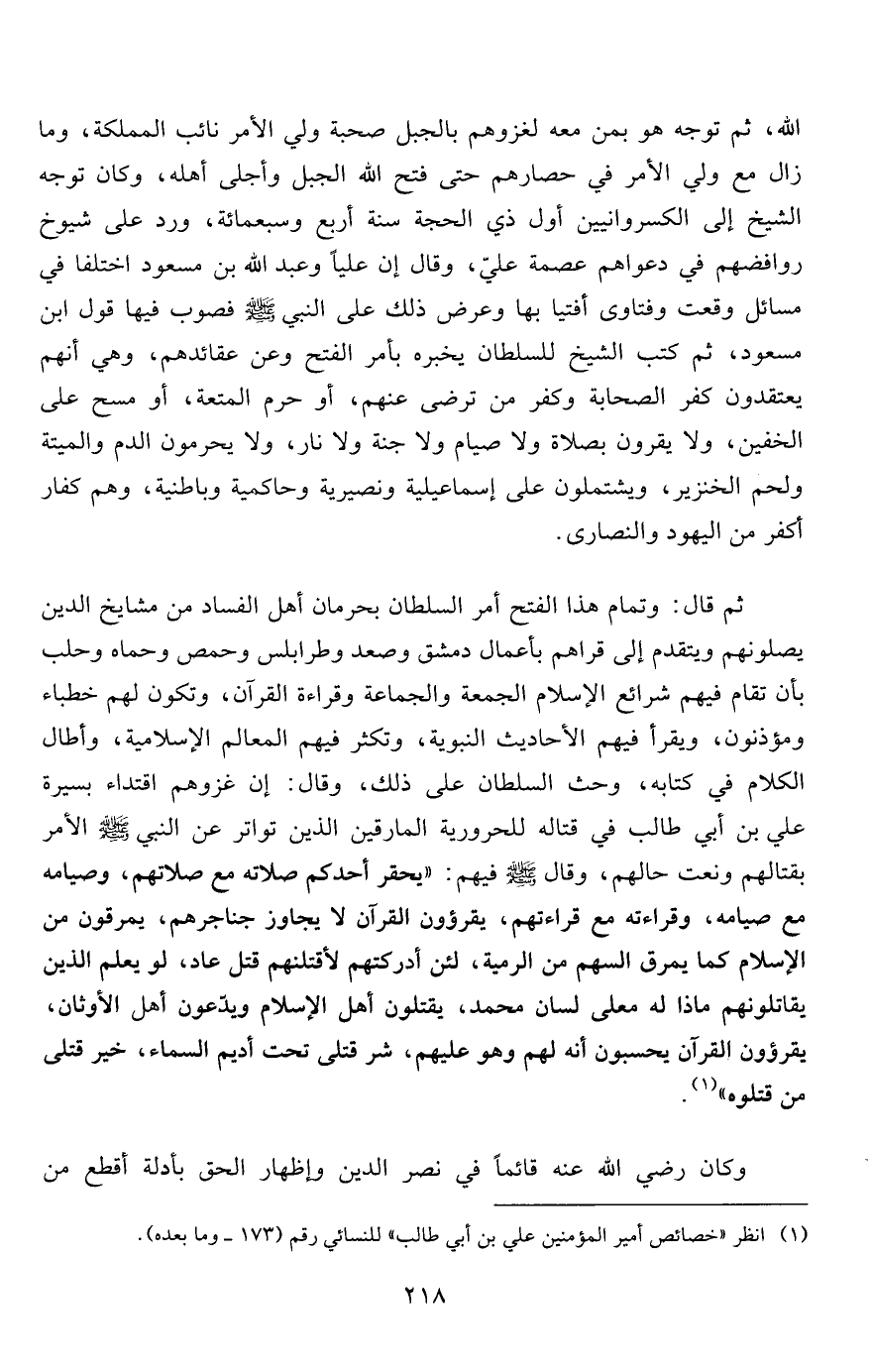 ثم قال: وتمام هذا الفتح أمر السلطان بحرمان أهل الفساد من مشايخ الدين يصلونهم ويتقدم إلى قراهم بأعمال دمشق وصعد وطرابلس وحمص وحماه وحلب بأن تقام فيهم شرائع الإسلام الجمعة والجماعة وقراءة القرآن، وتكون لهم خطباء ومؤذنون، ويقرأ فيهم الأحاديث النبوية، وتكثر فيهم المعالم الإسلامية، وأطال الكلام في كتابه، وحث السلطان على ذلك، وقال: إن غزوهم اقتداء بسيرة علي بن أبي طالب في قتاله للحرورية المارقين الذين تواتر عن النبي صلى الله عليه وسلم الأمر بقتالهم ونعت حالهم، وقال صلى الله عليه وسلم فيهم: "يحقر أحدكم صلاته مع صلاتهم، وصيامه مع صيامه، وقراءته مع قراءتهم، يقرؤون القرآن لا يجاوز جناجرهم، يمرقون من الإسلام كما يمرق السهم من الرمية، لئن أدركتهم لأقتلنهم قتل عاد، لو يعلم الذين يقاتلونهم ماذا له معلى لسان محمد، يقتلون أهل الإسلام ويدّعون أهل الأوثان، يقرؤون القرآن يحسبون أنه لهم وهو عليهم، شر قتلى تحت أديم السماء، خير قتلى من قتلوه"1.