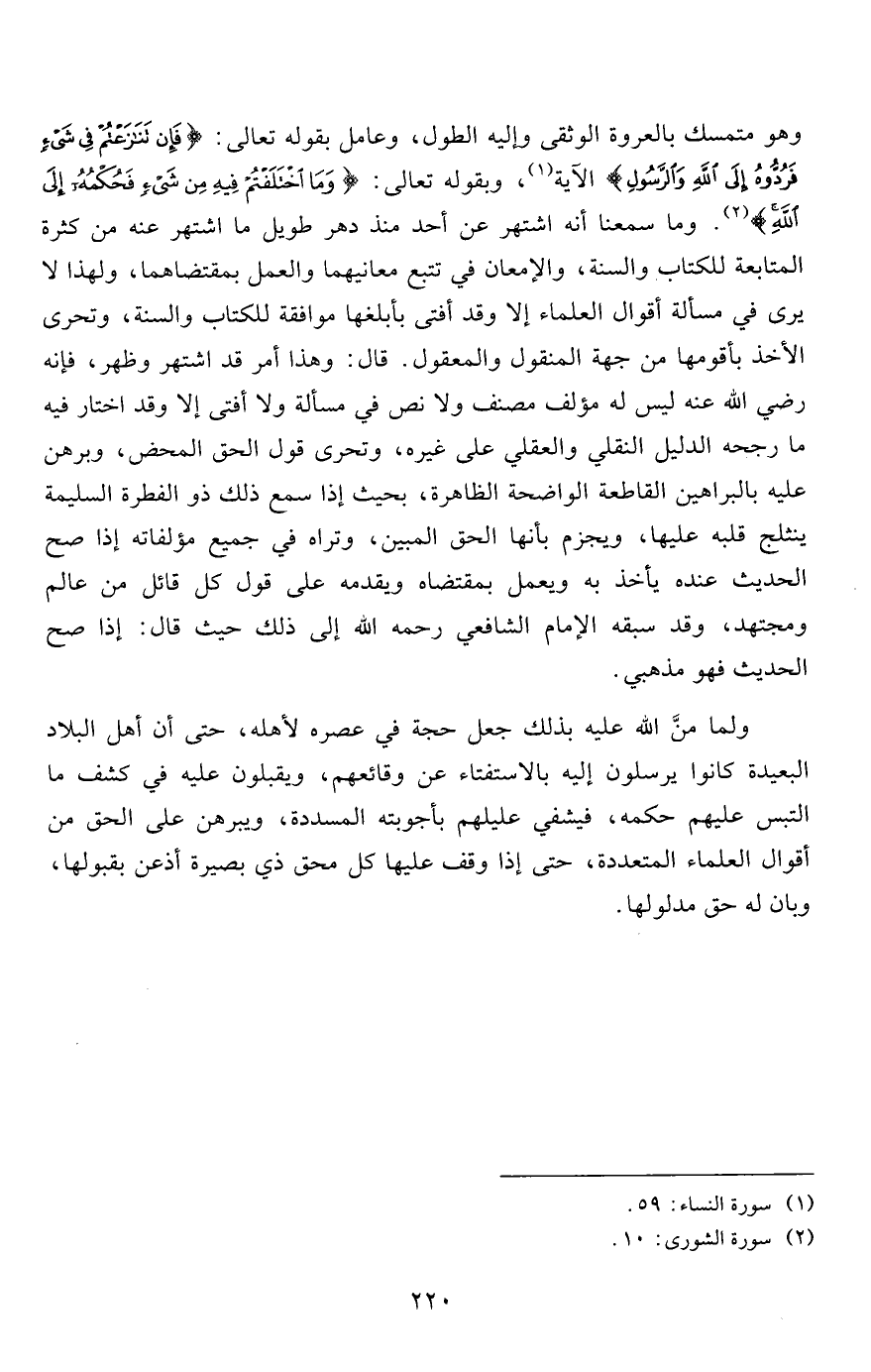 وهو متمسك بالعروة الوثقى وإليه الطول، وعامل بقوله تعالى: {فَإِنْ تَنَازَعْتُمْ فِي شَيْءٍ فَرُدُّوهُ إِلَى اللَّهِ وَالرَّسُولِ} 1 الآية، وبقوله تعالى: {وَمَا اخْتَلَفْتُمْ فِيهِ مِنْ شَيْءٍ فَحُكْمُهُ إِلَى اللَّهِ} 2. وما سمعنا أنه اشتهر عن أحد منذ دهر طويل ما اشتهر عنه من كثرة المتابعة للكتاب والسنة، والإمعان في تتبع معانيهما والعمل بمقتضاهما، ولهذا لا يرى في مسألة أقوال العلماء إلا وقد أفتى بأبلغها موافقة للكتاب والسنة، وتحرى الأخذ بأقومها من جهة المنقول والمعقول. قال: وهذا أمر قد اشتهر وظهر، فإنه رضي الله عنه ليس له مؤلف مصنف ولا نمى في مسألة ولا أفتى إلا وقد اختار فيه ما رجحه الدليل النقلي والعقلي على غيره، وتحرى قول الحق المحض، وبرهن عليه بالبراهين القاطعة الواضحة الظاهرة، بحيث إذا سمع ذلك ذو الفطرة السليمة ينثلج قلبه عليها، ويجزم بأنها الحق المبين، وتراه في جميع مؤلفاته إذا صح الحديث عنده يأخذ به ويعمل بمقتضاه ويقدمه على قول كل قائل من عالم ومجتهد، وقد سبقه الإمام الشافعي رحمه الله إلى ذلك حيث قال: إذا صح الحديث فهو مذهبي.