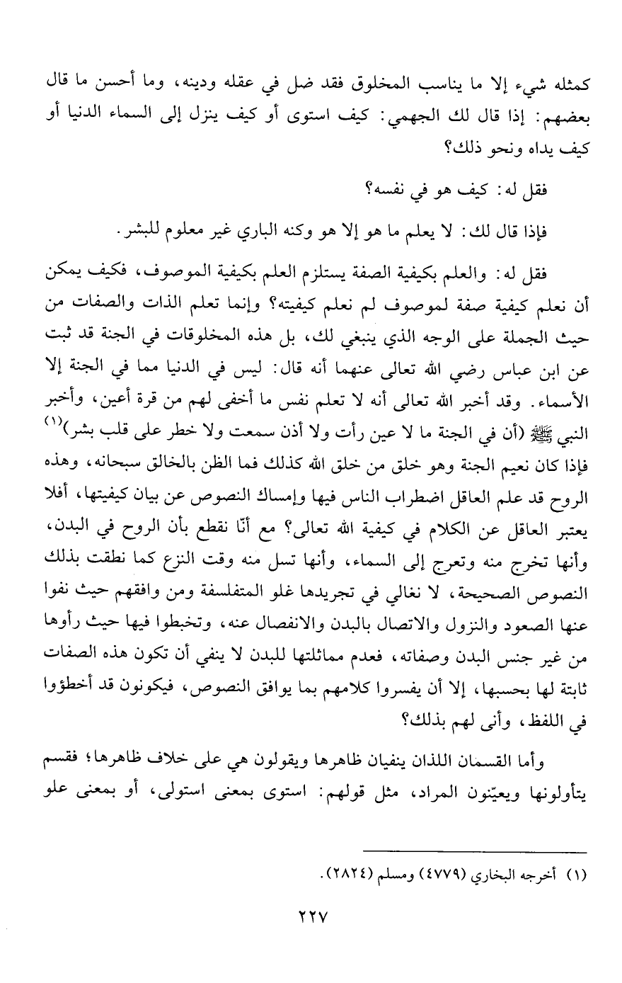 فقل له: والعلم بكيفية الصفة يستلزم العلم بكيفية الموصوف، فكيف يمكن أن نعلم كيفية صفة لموصوف لم نعلم كيفيته؟ وإنما تعلم الذات والصفات من حيث الجملة على الوجه الذي ينبغي لك، بل هذه المخلوقات في الجنة قد ثبت عن ابن عباس رضي الله تعالى عنهما أنه قال: ليس في الدنيا مما في الجنة إلا الأسماء. وقد أخبر الله تعالى أنه لا تعلم نفس ما أخفى لهم من قرة أعين، وأخبر النبي صلى الله عليه وسلم "أن في الجنة ما لا عين رأت ولا أذن سمعت ولا خطر على قلب بشر" 1 فإذا كان نعيم الجنة وهو خلق من خلق الله كذلك فما الظن بالخالق سبحانه، وهذه الروح قد علم العاقل اضطراب الناس فيها وإمساك النصوص عن بيان كيفيتها، أفلا يعتبر العاقل عن الكلام في كيفية الله تعالى؟ مع أنا نقطع بأن الروح في البدن، وأنها تخرج منه وتعرج إلى السماء، وأنها تسل منه وقت النزع كما نطقت بذلك النصوص الصحيحة، لا نغالي في تجريدها غلو المتفلسفة ومن وافقهم حيث نفوا عنها الصعود والنزول والاتصال بالبدن والانفصال عنه، وتخبطوا فيها حيث رأوها من غير جنس البدن وصفاته، فعدم مماثلتها للبدن لا ينفي أن تكون هذه الصفات ثابتة لها بحسبها، إلا أن يفسروا كلامهم بما يوافق النصوص، فيكونون قد أخطؤوا في اللفظ، وأنى لهم بذلك؟