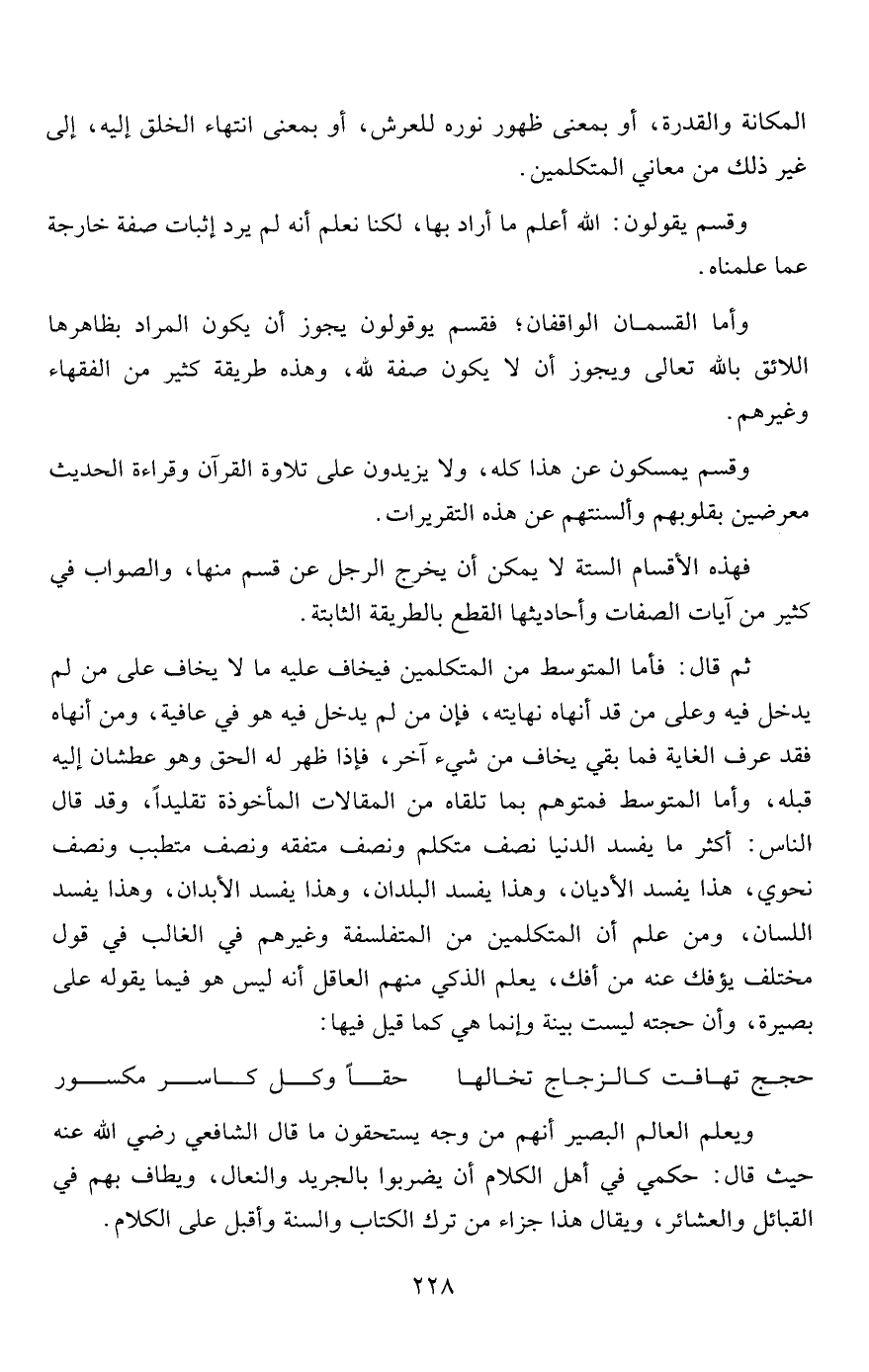 ويعلم العالم البصير أنهم من وجه يستحقون ما قال الشافعي رضي الله عنه حيث قال: حكمي في أهل الكلام أن يضربوا بالجريد والنعال، ويطاف بهم في القبائل والعشائر، ويقال هذا جزاء من ترك الكتاب والسنة وأقبل على الكلام.