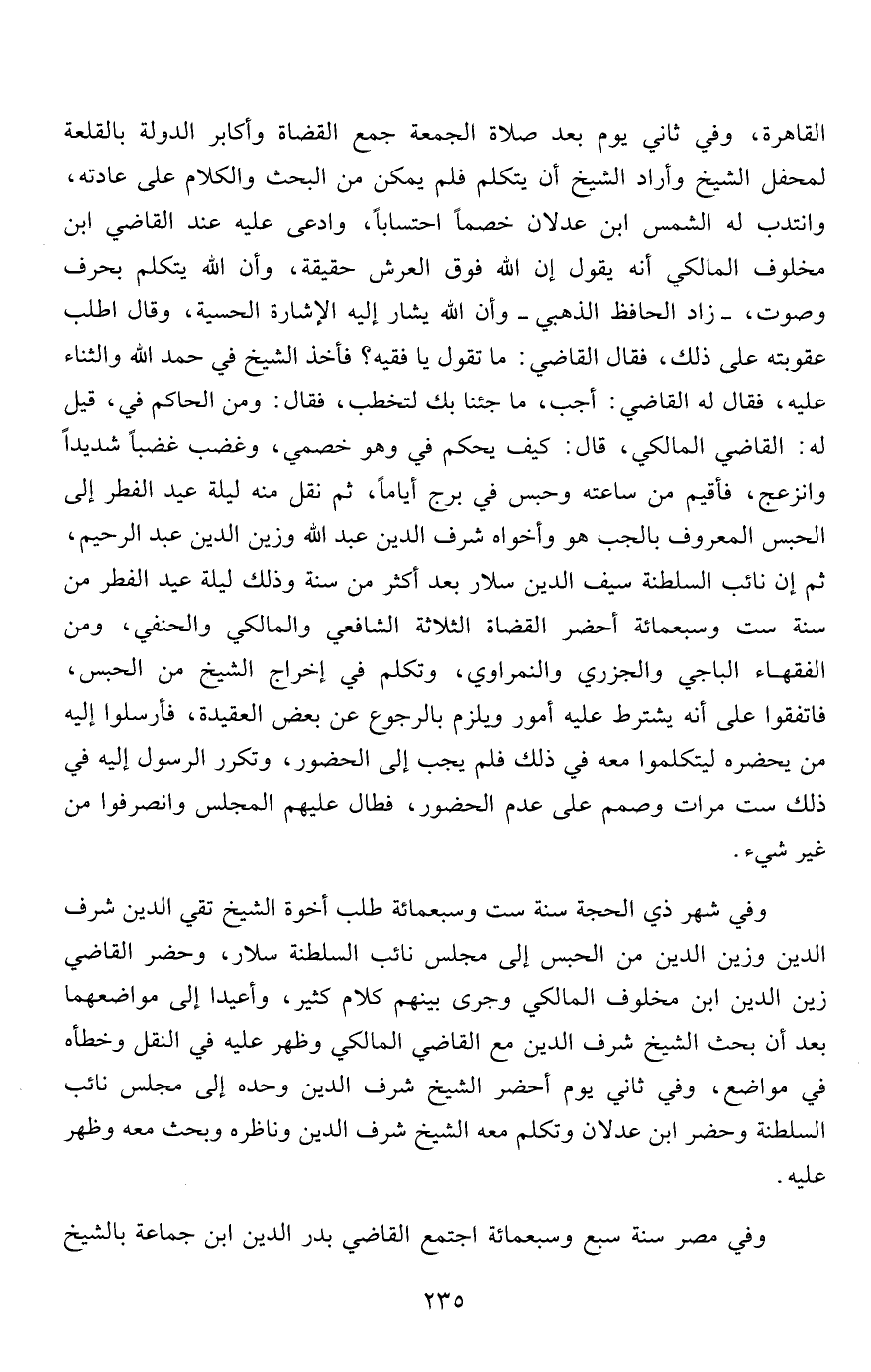 القاهرة، وفي ثاني يوم بعد صلاة الجمعة جمع القضاة وأكابر الدولة بالقلعة لمحفل الشيخ وأراد الشيخ أن يتكلم فلم يمكن من البحث والكلام على عادته، وانتدب له الشمس ابن عدلان خصماً احتساباً، وادعى عليه عند القاضي ابن مخلوف المالكي أنه يقول إن الله فوق العرش حقيقة، وأن الله يتكلم بحرف وصوت،- زاد الحافظ الذهبي- وأن الله يشار إليه الإشارة الحسية، وقال اطلب عقوبته على ذلك، فقال القاضي: ما تقول يا فقيه؟ فأخذ الشيخ في حمد الله والثناء عليه، فقال له القاضي: أجب، ما جئنا بك لتخطب، فقال: ومن الحاكم في، قيل له: القاضي المالكي، قال: كيف يحكم في وهو خصمي، وغضب غضباً شديداً وانزعج، فأقيم من ساعته وحبس في برج أياماً، ثم نقل منه ليلة عيد الفطر إلى الحبس المعروف بالجب هو وأخواه شرف الدين عبد الله وزين الدين عبد الرحيم، ثم إن نائب السلطنة سيف الدين سلار بعد أكثر من سنة وذلك ليلة عيد الفطر من سنة ست وسبعمائة أحضر القضاة الثلاثة الشافعي والمالكي والحنفي، ومن الفقهاء الباجي والجزري والنمراوي، وتكلم في إخراج الشيخ من الحبس، فاتفقوا على أنه يشترط عليه أمور ويلزم بالرجوع عن بعض العقيدة، فأرسلوا إليه من يحضره ليتكلموا معه في ذلك فلم يجب إلى الحضور، وتكرر الرسول إليه في ذلك ست مرات وصمم على عدم الحضور، فطال عليهم المجلس وانصرفوا من غير شيء.