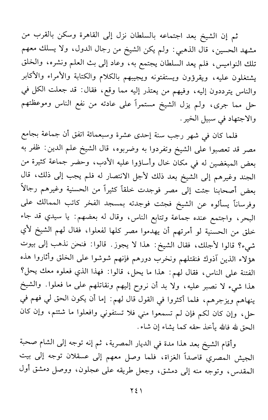 وأقام الشيخ بعد هذا مدة في الديار المصرية، ثم إنه توجه إلى الشام صحبة الجيش المصري قاصداً الغزاة، فلما وصل معهم إلى عسقلان توجه إلى بيت المقدس، وتوجه منه إلى دمشق، وجعل طريقه على عجلون، ووصل دمشق أول