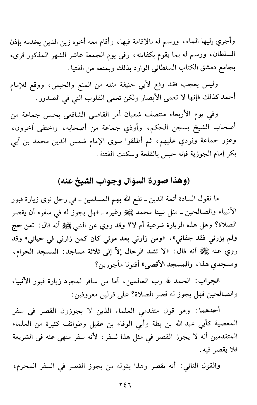 الجواب: الحمد لله رب العالمين، أما من سافر لمجرد زيارة قبور الأنبياء والصالحين فهل يجوز له قصر الصلاة؟ على قولين معروفين: