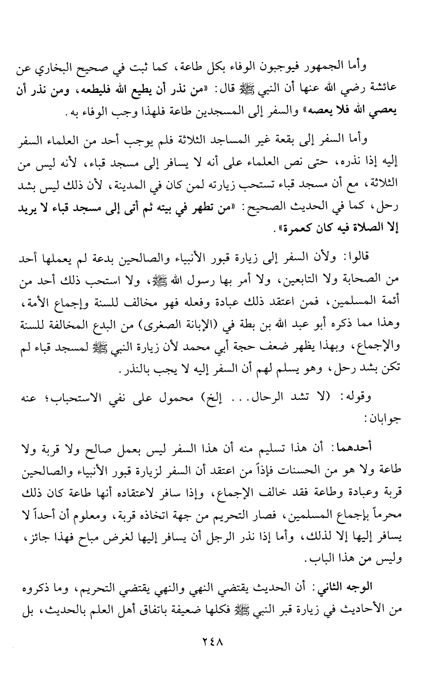 قالوا: ولأن السفر إلى زيارة قبور الأنبياء والصالحين بدعة لم يعملها أحد من الصحابة ولا التابعين، ولا أمر بها رسول الله صلى الله عليه وسلم، ولا استحب ذلك أحد من أئمة المسلمين، فمن اعتقد ذلك عبادة وفعله فهو مخالف للسنة وإجماع الأمة، وهذا مما ذكره أبو عبد الله بن بطة في "الإبانة الصغرى" من البدع المخالفة للسنة والإجماع، وبهذا يظهر ضعف حجة أبي محمد لأن زيارة النبي صلى الله عليه وسلم لمسجد قباء لم تكن بشد رحل، وهو يسلم لهم أن السفر إليه لا يجب بالنذر.