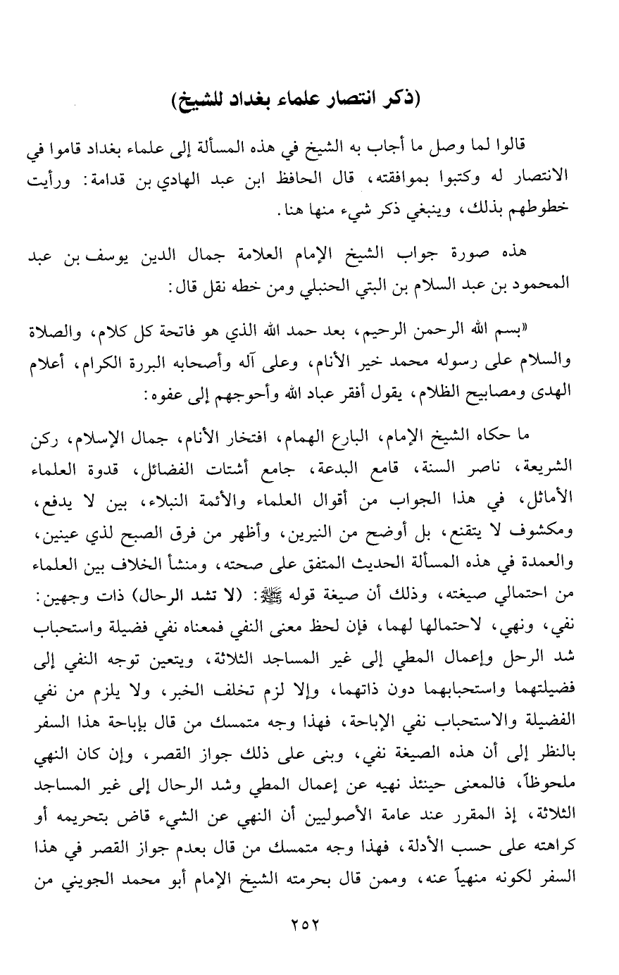 ما حكاه الشيخ الإمام، البارع الهمام، افتخار الأنام، جمال الإسلام، ركن الشريعة، ناصر السنة، قامع البدعة، جامع أشتات الفضائل، قدوة العلماء الأماثل، في هذا الجواب من أقوال العلماء والأئمة النبلاء، بين لا يدفع، ومكشوف لا يتقنع، بل أوضح من النيرين، وأظهر من فرق الصبح لذي عينين، والعمدة في هذه المسألة الحديث المتفق على صحته، ومنشأ الخلاف بين العلماء من احتمالي صيغته، وذلك أن صيغة قوله صلى الله عليه وسلم: "لا تشد الرحال" ذات وجهين: نفي، ونهي، لاحتمالها لهما، فإن لحظ معنى النفي فمعناه نفي فضيلة واستحباب شد الرحل وإعمال المطي إلى غير المساجد الثلاثة، ويتعين توجه النفي إلى فضيلتهما واستحبابهما دون ذاتهما، وإلا لزم تخلف الخبر، ولا يلزم من نفي الفضيلة والاستحباب نفي الإباحة، فهذا وجه متمسك من قال بإباحة هذا السفر بالنظر إلى أن هذه الصيغة نفي، وبنى على ذلك جواز القصر، وإن كان النهي ملحوظاً، فالمعنى حينئذ نهيه عن إعمال المطي وشد الرحال إلى غير المساجد الثلاثة، إذ المقرر عند عامة الأصوليين أن النهي عن الشيء قاض بتحريمه أو كراهته على حسب الأدلة، فهذا وجه متمسك من قال بعدم جواز القصر في هذا السفر لكونه منهياً عنه، وممن قال بحرمته الشيخ الإمام أبو محمد الجويني من