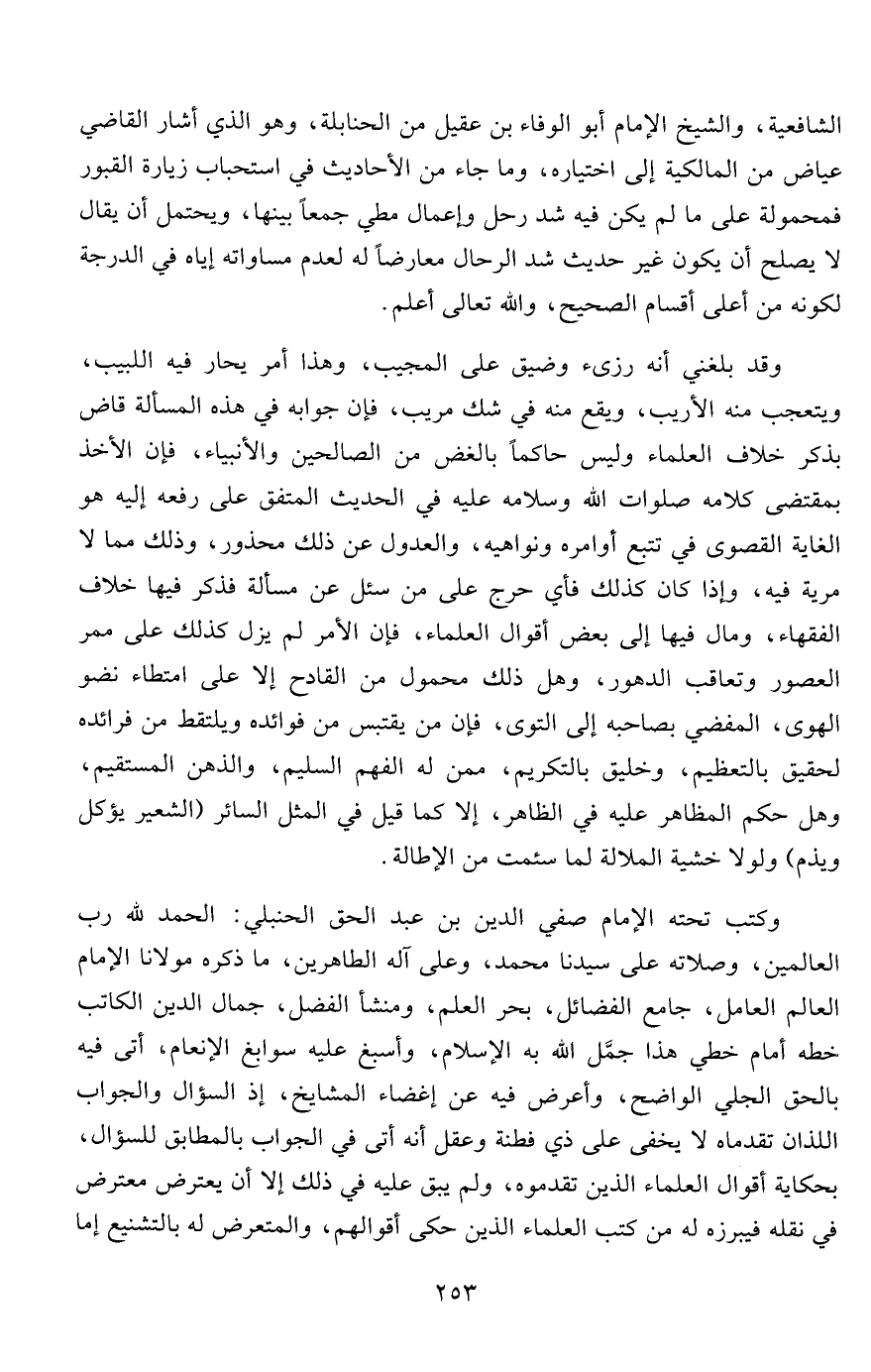 وكتب تحته الإمام صفي الدين بن عبد الحق الحنبلي: الحمد لله رب العالمين، وصلاته على سيدنا محمد، وعلى آله الطاهرين، ما ذكره مولانا الإمام العالم العامل، جامع الفضائل، بحر العلم، ومنشأ الفضل، جمال الدين الكاتب خطه أمام خطي هذا جمل الله به الإسلام، وأسبغ عليه سوابغ الإنعام، أتى فيه بالحق الجلي الواضح، وأعرض فيه عن إغضاء المشايخ، إذ السؤال والجواب اللذان تقدماه لا يخفى على ذي فطنة وعقل أنه أتى في الجواب بالمطابق للسؤال، بحكاية أقوال العلماء الذين تقدموه، ولم يبق عليه في ذلك إلا أن يعترض معترض في نقله فيبرزه له من كتب العلماء الذين حكى أقوالهم، والمتعرض له بالتشنيع إما