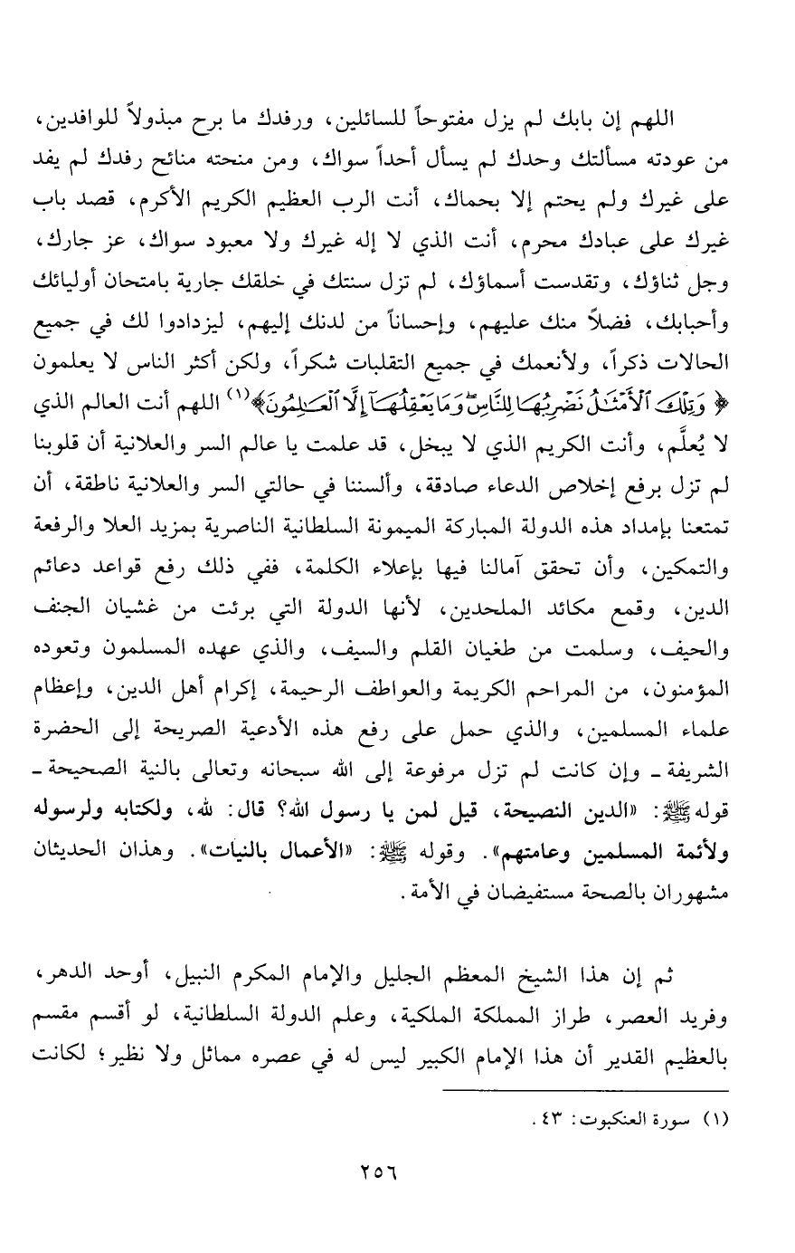 اللهم إن بابك لم يزل مفتوحاً للسائلين، ورفدك ما برح مبذولاً للوافدين، من عودته مسألتك وحدك لم يسأل أحداً سواك، ومن منحته منائح رفدك لم يفد على غيرك ولم يحتم إلا بحماك، أنت الرب العظيم الكريم الأكرم، قصد باب غيرك على عبادك محرم، أنت الذي لا إله غيرك ولا معبود سواك، عز جارك، وجل ثناؤك، وتقدست أسماؤك، لم تزل سنتك في خلقك جارية بامتحان أوليائك وأحبابك، فضلاً منك عليهم، وإحساناً من لدنك إليهم، ليزدادوا لك في جميع الحالات ذكراً، ولأنعمك في جميع التقلبات شكراً، ولكن أكثر الناس لا يعلمون {وَتِلْكَ الْأَمْثَالُ نَضْرِبُهَا لِلنَّاسِ وَمَا يَعْقِلُهَا إِلَّا الْعَالِمُونَ} 1 اللهم أنت العالم الذي لا يعلم، وأنت الكريم الذي لا يبخل، قد علمت يا عالم السر والعلانية أن قلوبنا لم تزل برفع إخلاص الدعاء صادقة، وألسننا في حالتي السر والعلانية ناطقة، أن تمتعنا بإمداد هذه الدولة المباركة الميمونة السلطانية الناصرية بمزيد العلا والرفعة والتمكين، وأن تحقق آمالنا فيها بإعلاء الكلمة، ففي ذلك رفع قواعد دعائم الدين، وقمع مكائد الملحدين، لأنها الدولة التي برئت من غشيان الجنف والحيف، وسلمت من طغيان القلم والسيف، والذي عهده المسلمون وتعوده المؤمنون، من المراحم الكريمة والعواطف الرحيمة، إكرام أهل الدين، وإعظام علماء المسلمين، والذي حمل على رفع هذه الأدعية الصريحة إلى الحضرة الشريفة- وإن كانت لم تزل مرفوعة إلى الله سبحانه وتعالى بالنية الصحيحة- قوله صلى الله عليه وسلم: "الدين النصيحة، قيل لمن يا رسول الله؟ قال: لله، ولكتابه ولرسوله ولأئمة المسلمين وعامتهم ". وقوله صلى الله عليه وسلم: "الأعمال بالنيات". وهذان الحديثان مشهوران بالصحة مستفيضان في الأمة.