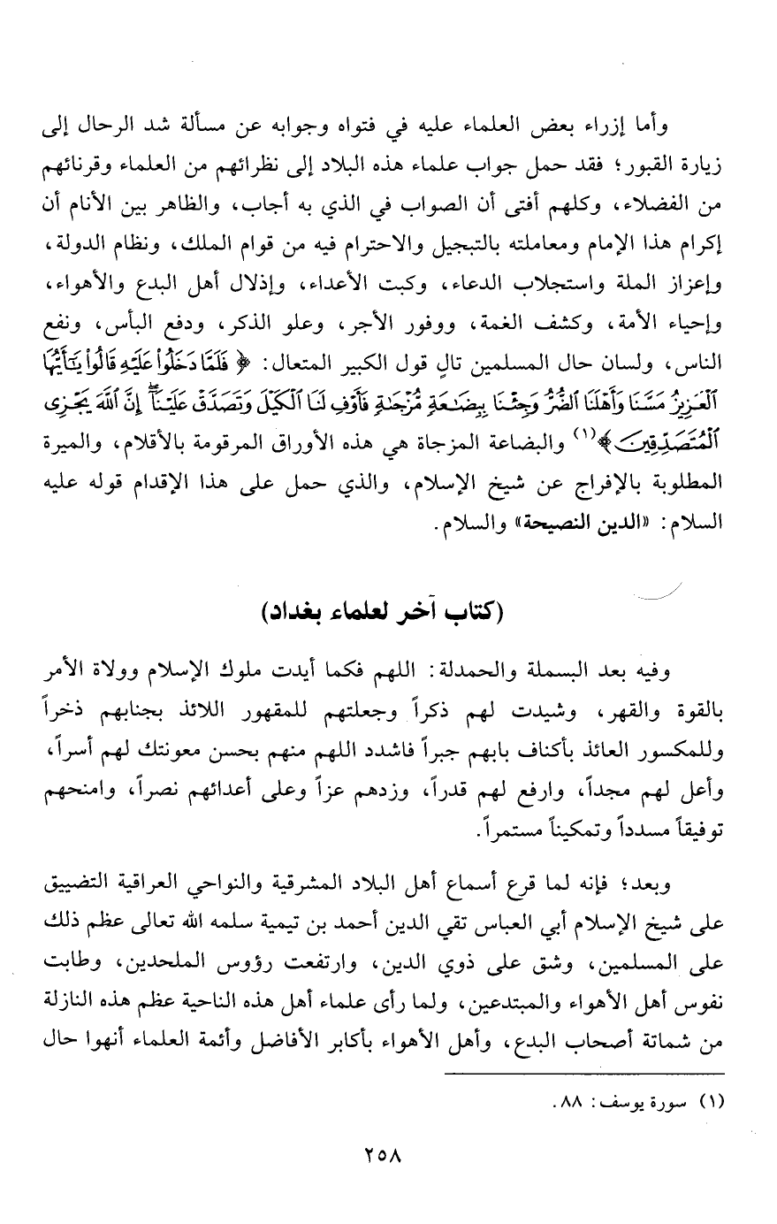 وأما إزراء بعض العلماء عليه في فتواه وجوابه عن مسألة شد الرحال إلى زيارة القبور؛ فقد حمل جواب علماء هذه البلاد إلى نظرائهم من العلماء وقرنائهم من الفضلاء، وكلهم أفتى أن الصواب في الذي به أجاب، والظاهر بين الأنام أن إكرام هذا الإمام ومعاملته بالتبجيل والاحترام فيه من قوام الملك، ونظام الدولة، وإعزاز الملة واستجلاب الدعاء، وكبت الأعداء، وإذلال أهل البدع والأهواء، وإحياء الأمة، وكشف الغمة، ووفور الأجر، وعلو الذكر، ودفع البأس، ونفع الناس، ولسان حال المسلمين تالٍ قول الكبير المتعال: {فَلَمَّا دَخَلُوا عَلَيْهِ قَالُوا يَا أَيُّهَا الْعَزِيزُ مَسَّنَا وَأَهْلَنَا الضُّرُّ وَجِئْنَا بِبِضَاعَةٍ مُزْجَاةٍ فَأَوْفِ لَنَا الْكَيْلَ وَتَصَدَّقْ عَلَيْنَا إِنَّ اللَّهَ يَجْزِي الْمُتَصَدِّقِينَ} 1 والبضاعة المزجاة هي هذه الأوراق المرقومة بالأقلام، والميرة المطلوبة بالإفراج عن شيخ الإسلام، والذي حمل على هذا الإقدام قوله عليه السلام: "الدين النصيحة" والسلام.