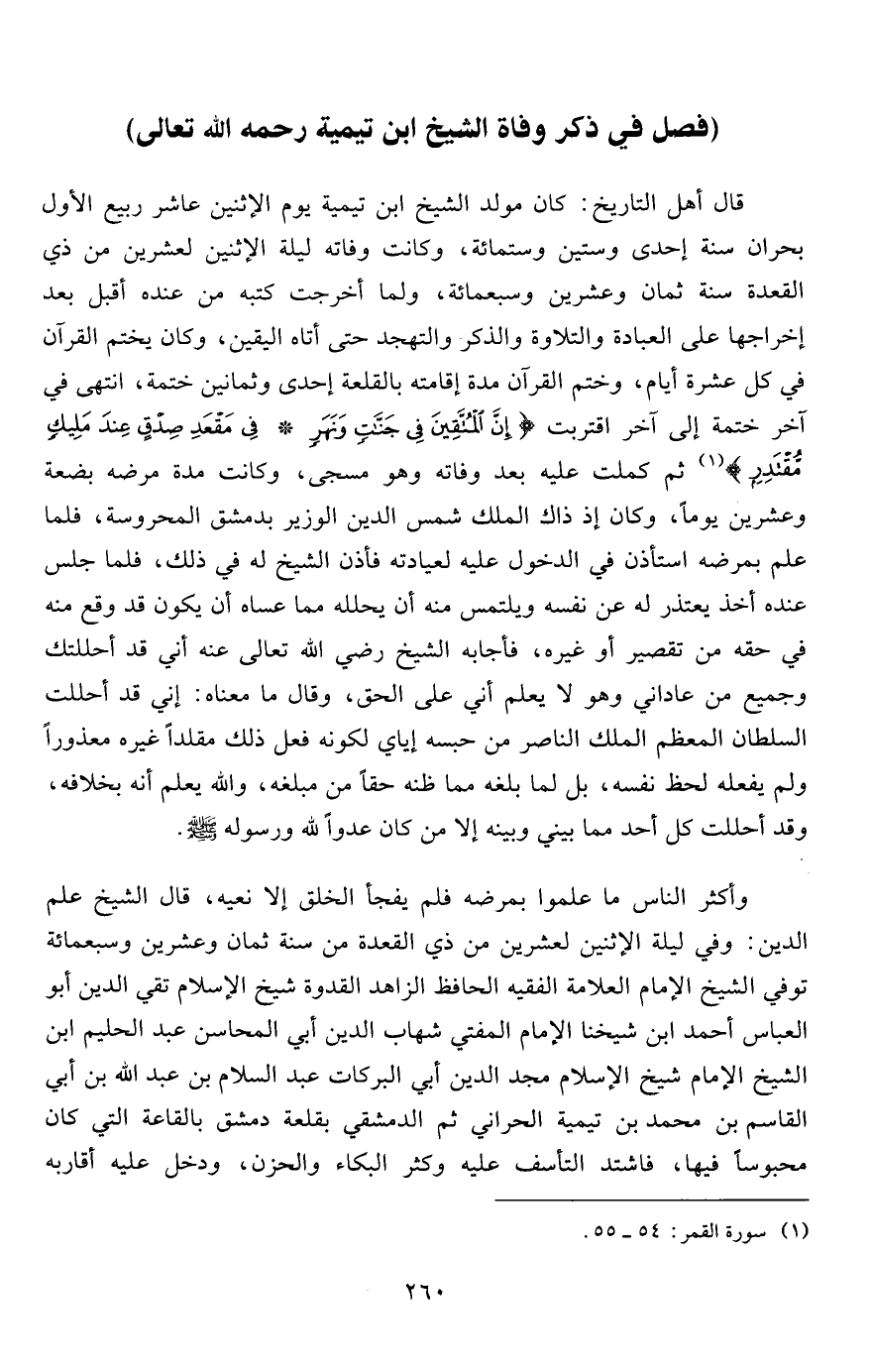 قال أهل التاريخ: كان مولد الشيخ ابن تيمية يوم الاثنين عاشر ربيع الأول بحران سنة إحدى وستين وستمائة، وكانت وفاته ليلة الاثنين لعشرين من ذي القعدة سنة ثمان وعشرين وسبعمائة، ولما أخرجت كتبه من عنده أقبل بعد إخراجها على العبادة والتلاوة والذكر والتهجد حتى أتاه اليقين، وكان يختم القرآن في كل عشرة أيام، وختم القرآن مدة إقامته بالقلعة إحدى وثمانين ختمة، انتهى في آخر ختمة إلى آخر اقتربت {إِنَّ الْمُتَّقِينَ فِي جَنَّاتٍ وَنَهَرٍ * فِي مَقْعَدِ صِدْقٍ عِنْدَ مَلِيكٍ مُقْتَدِرٍ} 1 ثم كملت عليه بعد وفاته وهو مسجى، وكانت مدة مرضه بضعة وعشرين يوماً، وكان إذ ذاك الملك شمس الدين الوزير بدمشق المحروسة، فلما علم بمرضه استأذن في الدخول عليه لعيادته فأذن الشيخ له في ذلك، فلما جلس عنده أخذ يعتذر له عن نفسه ويلتمس منه أن يحلله مما عساه أن يكون قد وقع منه في حقه من تقصير أو غيره، فأجابه الشيخ رضي الله تعالى عنه أني قد أحللتك وجميع من عاداني وهو لا يعلم أني على الحق، وقال ما معناه: إني قد أحللت السلطان المعظم الملك الناصر من حبسه إياي لكونه فعل ذلك مقلداً غيره معذوراً ولم يفعله لحظ نفسه، بل لما بلغه مما ظنه حقا من مبلغه، والله يعلم أنه بخلافه، وقد أحللت كل أحد مما بيني وبينه إلا من كان عدوا لله ورسوله صلى الله عليه وسلم.