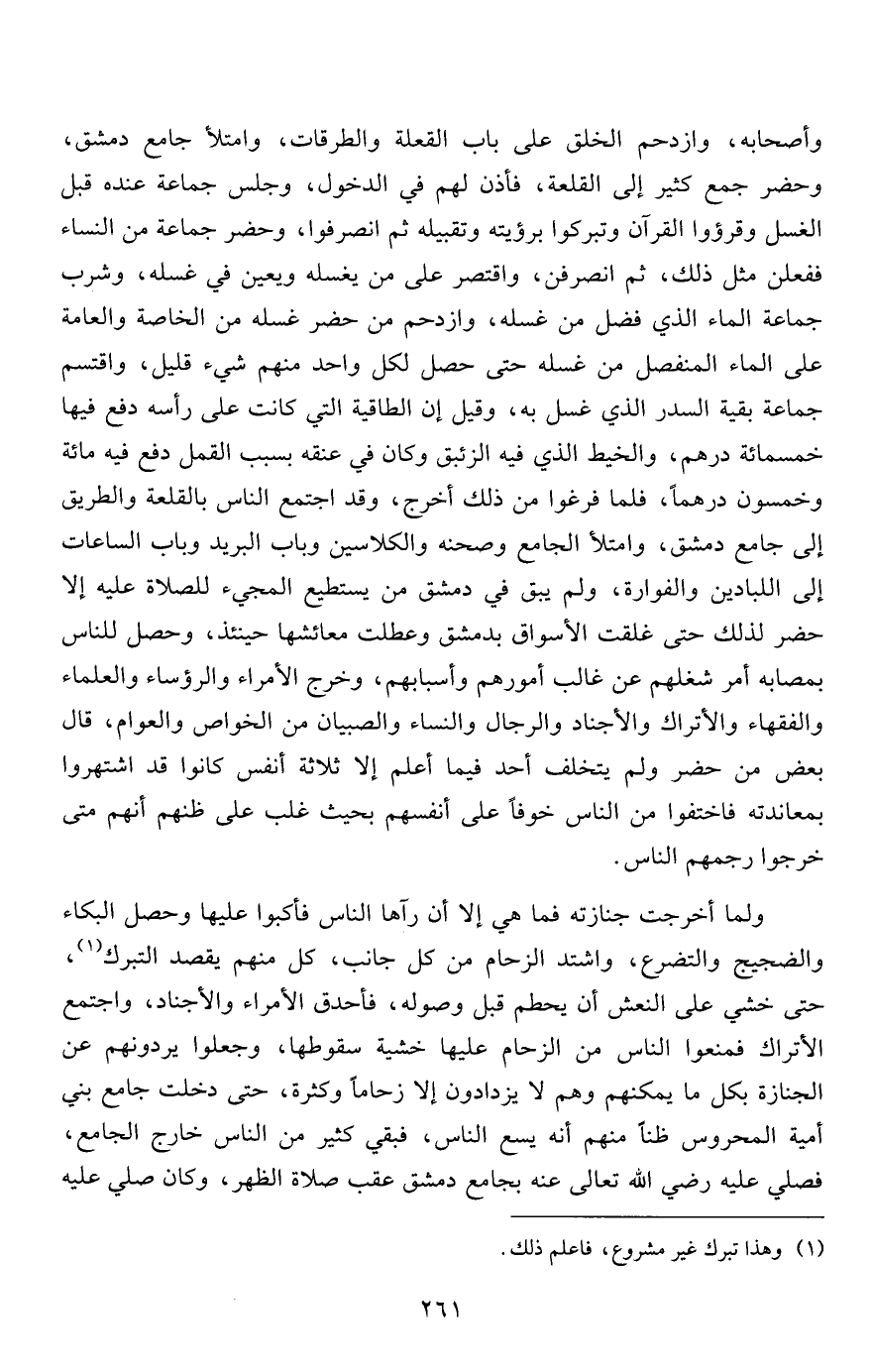 وأصحابه، وازدحم الخلق على باب القلعة والطرقات، وامتلأ جامع دمشق، وحضر جمع كثير إلى القلعة، فأذن لهم في الدخول، وجلس جماعة ضده قبل الغسل وقرؤوا القرآن وتبركوا برؤيته وتقبيله ثم انصرفوا، وحضر جماعة من النساء ففعلن مثل ذلك، ثم انصرفن، واقتصر على من يغسله ويعين في غسله، وشرب جماعة الماء الذي فضل من غسله، وازدحم من حضر غسله من الخاصة والعامة على الماء المنفصل من غسله حتى حصل لكل واحد منهم شيء قليل، واقتسم جماعة بقية السدر الذي غسل به، وقيل إن الطاقية التي كانت على رأسه دفع فيها خمسمائة درهم، والخيط الذي فيه الزئبق وكان في عنقه بسبب القمل دفع فيه مائة وخمسون درهماً، فلما فرغوا من ذلك أخرج، وقد اجتمع الناس بالقلعة والطريق إلى جامع دمشق، وامتلأ الجامع وصحنه والكلاسين وباب البريد وباب الساعات إلى اللبادين والفوارة، ولم يبق في دمشق من يستطيع المجيء للصلاة عليه إلا حضر لذلك حتى غلقت الأسواق بدمشق وعطلت معائشها حينئذ، وحصل للناس بمصابه أمر شغلهم عن غالب أمورهم وأسبابهم، وخرج الأمراء والرؤساء والعلماء والفقهاء والأتراك والأجناد والرجال والنساء والصبيان من الخواص والعوام، قال بعض من حضر ولم يتخلف أحد فيما أعلم إلا ثلاثة أنفس كانوا قد اشتهروا بمعاندته فاختفوا من الناس خوفاً على أنفسهم بحيث غلب على ظنهم أنهم متى خرجوا رجمهم الناس.