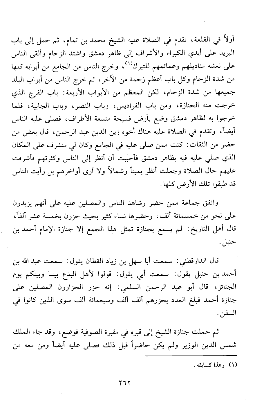 واتفق جماعة ممن حضر وشاهد الناس والمصلين عليه على أنهم يزيدون على نحو من خمسمائة ألف، وحضرها نساء كثير بحيث حزرن بخمسة عشر ألفا، قال أهل التاريخ: لم يسمع بجنازة تمثل هذا الجمع إلا جنازة الإمام أحمد بن حنبل.