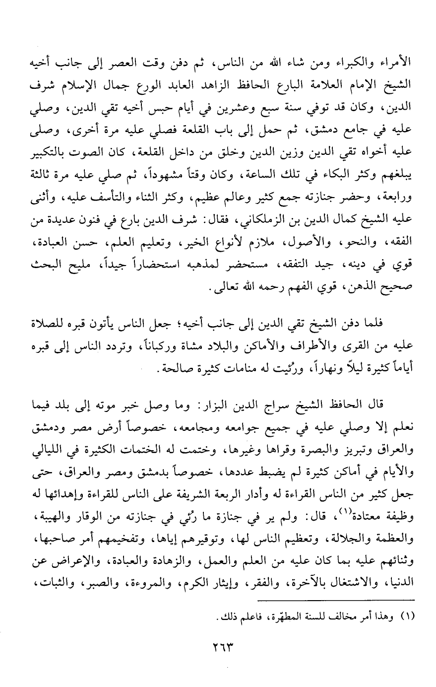 الأمراء والكبراء ومن شاء الله من الناس، ثم دفن وقت العصر إلى جانب أخيه الشيخ الإمام العلامة البارع الحافظ الزاهد العابد الورع جمال الإسلام شرف الدين، وكان قد توفي سنة سبع وعشرين في أيام حبس أخيه تقي الدين، وصلي عليه في جامع دمشق، ثم حمل إلى باب القلعة فصلي عليه مرة أخرى، وصلى عليه أخواه تقي الدين وزين الدين وخلق من داخل القلعة، كان الصوت بالتكبير يبلغهم وكثر البكاء في تلك الساعة، وكان وقتاً مشهوداً، ثم صلي عليه مرة ثالثة ورابعة، وحضر جنازته جمع كثير وعالم عظيم، وكثر الثناء والتأسف عليه، وأثنى عليه الشيخ كمال الدين بن الزملكاني، فقال: شرف الدين بارع في فنون عديدة من الفقه، والنحو، والأصول، ملازم لأنواع الخير، وتعليم العلم، حسن العبادة، قوي في دينه، جيد التفقه، مستحضر لمذهبه استحضاراً جيداً، مليح البحث صحيح الذهن، قوي الفهم رحمه الله تعالى.