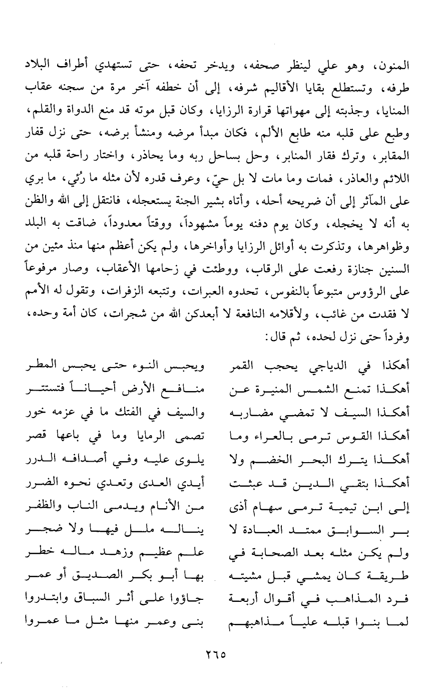 المنون، وهو علي لينظر صحفه، ويدخر تحفه، حتى تستهدي أطراف البلاد طرفه، وتستطلع بقايا الأقاليم شرفه، إلى أن خطفه آخر مرة من سجنه عقاب المنايا، وجذبته إلى مهواتها قرارة الرزايا، وكان قبل موته قد منع الدواة والقلم، وطبع على قلبه منه طابع الألم، فكان مبدأ مرضه ومنشأ برضه، حتى نزل قفار المقابر، وترك فقار المنابر، وحل بساحل ربه وما يحاذر، واختار راحة قلبه من اللائم والعاذر، فمات وما مات لا بل حيّ، وعرف قدره لأن مثله ما رُئي، ما بري على المآثر إلى أن ضريحه أحله، وأتاه بشير الجنة يستعجله، فانتقل إلى الله والظن به أنه لا يخجله، وكان يوم دفنه يوماً مشهوداً، ووقتاً معدوداً، ضاقت به البلد وظواهرها، وتذكرت به أوائل الرزايا وأواخرها، ولم يكن أعظم منها منذ مئين من السنين جنازة رفعت على الرقاب، ووطئت في زحامها الأعقاب، وصار مرفوعاً على الرؤوس متبوعاً بالنفوس، تحدوه العبرات، وتتبعه الزفرات، وتقول له الأمم لا فقدت من غائب، ولأقلامه النافعة لا أبعدكن الله من شجرات، كان أمة وحده، وفرداً حتى نزل لحده، ثم قال: