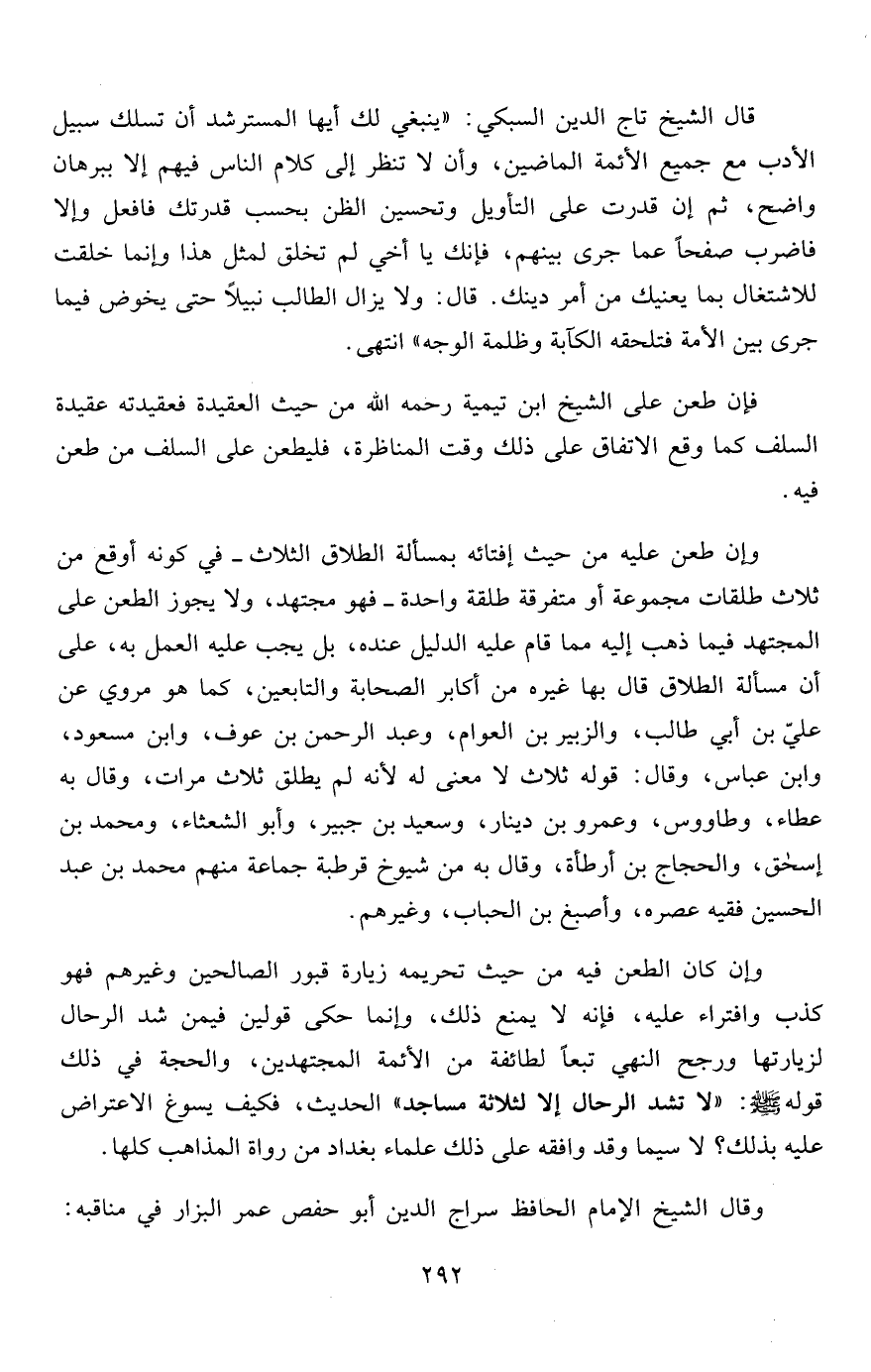 وإن كان الطعن فيه من حيث تحريمه زيارة قبور الصالحين وغيرهم فهو كذب وافتراء عليه، فإنه لا يمنع ذلك، وإنما حكى قولين فيمن شد الرحال لزيارتها ورجح النهي تبعاً لطائفة من الأئمة المجتهدين، والحجة في ذلك قوله صلى الله عليه وسلم: "لا تشد الرحال إلا لثلاثة مساجد" الحديث، فكيف يسوخ الاعتراض عليه بذلك؟ لاسيما وقد وافقه على ذلك علماء بغداد من رواة المذاهب كلها. وقال الشيخ الإمام الحافظ سراج الدين أبو حفص عمر البزار في مناقبه: