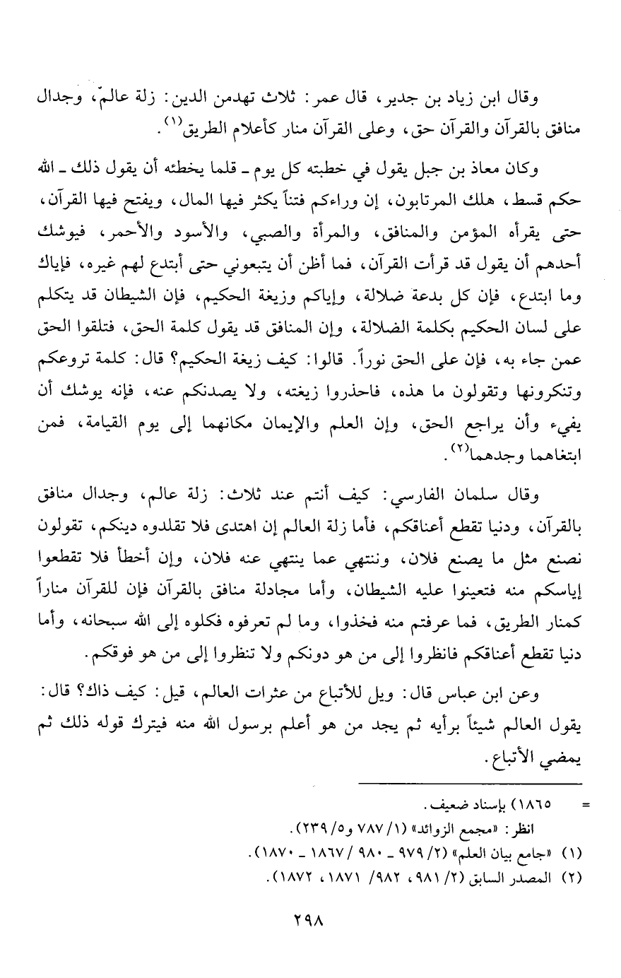 وقال ابن زياد بن جدير، قال عمر: ثلاث تهدمن الدين: زلة عالم، وجدال منافق بالقرآن والقرآن حق، وعلى القرآن منار كأعلام الطريق 1.