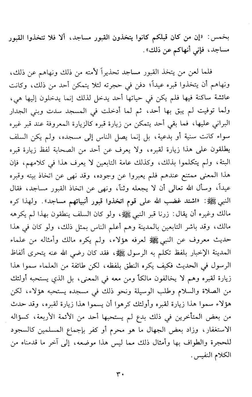 فلما لعن من يتخذ القبور مساجد تحذيراً لأمته من ذلك ونهاهم عن ذلك، ونهاهم أن يتخذوا قبره عيداً؛ دفن في حجرته لئلا يتمكن أحد من ذلك، وكانت عائشة ساكنة فيها فلم يكن في حياتها أحد يدخل لذلك إنما يدخلون إليها هي، ولما توفيت لم يبق بها أحد، ثم لما أدخلت في المسجد سدت وبني الجدار البراني عليها، فما بقي أحد يتمكن من زيارة قبره كالزيارة المعروفة عند قبر غيره سواء كانت سنية أو بدعية، بل إنما يصل الناس إلى مسجده، ولم يكن السلف يطلقون على هذا زيارة لقبره، ولا يعرف عن أحد من الصحابة لفظ زيارة قبره البتة، ولم يتكلموا بذلك، وكذلك عامة التابعين لا يعرف هذا في كلامهم، فإن هذا المعنى ممتنع عندهم فلم يعبروا عن وجوده، وقد نهى عن اتخاذ بيته وقبره عيداً، وسأل الله تعالى أن لا يجعله وثناً، ونهى عن اتخاذ القبور مساجد، فقال النبي صلى الله عليه وسلم: "اشتد غضب الله على قوم اتخذوا قبور أنبيائهم مساجد". ولهذا كره مالك وغيره أن يقال: زرنا قبر النبي صلى الله عليه وسلم، ولو كان السلف ينطقون بهذا لم يكرهه مالك، وقد باشر التابعين بالمدينة وهم أعلم الناس بمثل ذلك، ولو كان في هذا حديث معروف عن النبي صلى الله عليه وسلم لعرفه هؤلاء، ولم يكره مالك وأمثاله من علماء المدينة الإخبار بلفظ تكلم به الرسول صلى الله عليه وسلم، فقد كان رضي الله عنه يتحرى ألفاظ الرسول في الحديث فكيف يكره النطق بلفظه، لكن طائفة من العلماء سموا هذا زيارة لقبره وهم لا يخالفون مالكاً ومن معه في المعنى، بل الذي يستحبه أولئك من الصلاة والسلام وطلب الوسيلة ونحو ذلك في مسجده يستحبه هؤلاء، لكن هؤلاء سموا هذا زيارة لقبره وأولئك كرهوا أن يسموا هذا زيارة لقبره، وقد حدث من بعض المتأخرين في ذلك بدع لم يستحبها أحد من الأئمة الأربعة، كسؤاله الاستغفار، وزاد بعض الجهال ما هو محرم أو كفر بإجماع المسلمين كالسجود للحجرة والطواف بها وأمثال ذلك مما ليس هذا موضعه، إلى آخر ما قدمناه من الكلام النفيس.