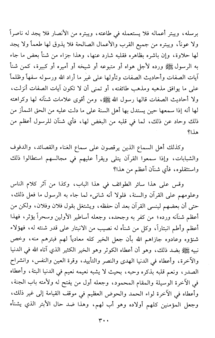 برسله، ويبتر أعماله فلا يستعمله في طاعته، ويبتره من الأنصار فلا يجد له ناصراً ولا عوناً، ويبتره من جميع القرب والأعمال الصالحة فلا يذوق لها طعماً ولا يجد لها حلاوة، وإن باشره بظاهره فقلبه شارد عنها، وهذا جزاء من شنأ بعض ما جاء به الرسول صلى الله عليه وسلم ورده لأجل هواه أو متبوعه أو شيخه أو أميره أو كبيرة، كمن شنأ آيات الصفات وأحاديث الصفات وتأولها على غير ما أراد الله ورسوله سفها وظلما على ما يوافق مذهبه ومذهب طائفته، أو تمنى أن لا تكون آيات الصفات أنزلت، ولا أحاديث الصفات قالها رسول الله صلى الله عليه وسلم، ومن أقوى علامات شنآنه لها وكراهته لها أنه إذا سمعها حين يستدل بها أهل السنة على ما دلت عليه من الحق اشمأز من ذلك وحاد عن ذلك، لما في قلبه من البغض لها، فأي شنآن للرسول أعظم من هذا؟