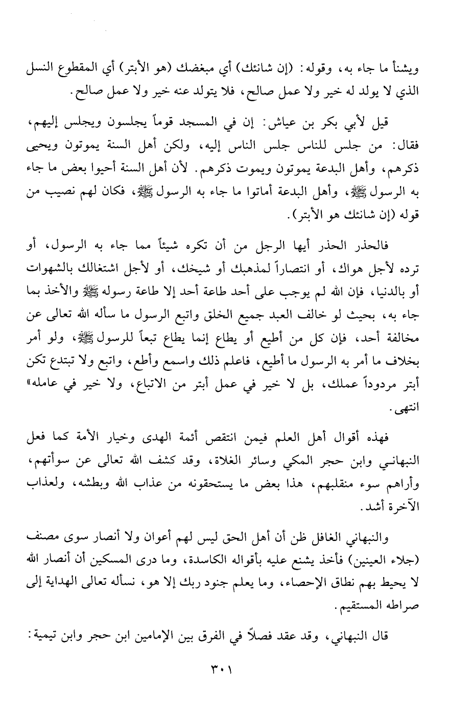 فالحذر الحذر أيها الرجل من أن تكره شيئاً مما جاء به الرسول، أو ترده لأجل هواك، أو انتصاراً لمذهبك أو شيخك، أو لأجل اشتغالك بالشهوات أو بالدنيا، فإن الله لم يوجب على أحد طاعة أحد إلا طاعة رسوله صلى الله عليه وسلم والأخذ بما جاء به، بحيث لو خالف العبد جميع الخلق واتبع الرسول ما سأله الله تعالى عن مخالفة أحد، فإن كل من أطيع أو يطاع إنما يطاع تبعاً للرسول صلى الله عليه وسلم، ولو أمر بخلاف ما أمر به الرسول ما أطيع، فاعلم ذلك واسمع وأطع، واتبع ولا تبتدع تكن أبتر مردوداً عملك، بل لا خير في عمل أبتر من الاتباع، ولا خير في عامله" انتهى.