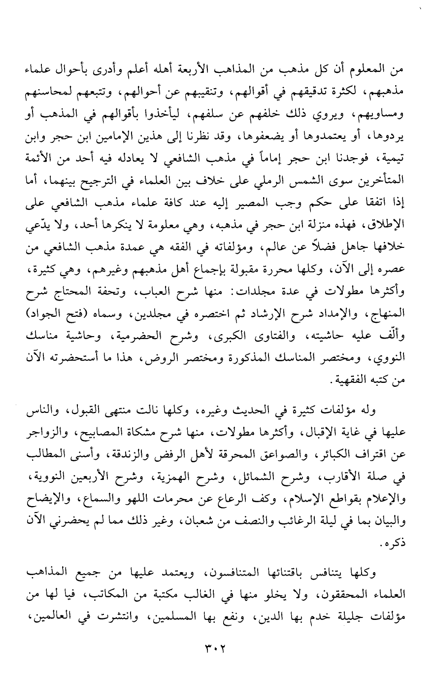من المعلوم أن كل مذهب من المذاهب الأربعة أهله أعلم وأدرى بأحوال علماء مذهبهم، لكثرة تدقيقهم في أقوالهم، وتنقيبهم عن أحوالهم، وتتبعهم لمحاسنهم ومساويهم، ويروي ذلك خلفهم عن سلفهم، ليأخذوا بأقوالهم في المذهب أو يردوها، أو يعتمدوها أو يضعفوها، وقد نظرنا إلى هذين الإمامين ابن حجر وابن تيمية، فوجدنا ابن حجر إماماً في مذهب الشافعي لا يعادله فيه أحد من الأئمة المتأخرين سوى الشمس الرملي على خلاف بين العلماء في الترجيح بينهما، أما إذا اتفقا على حكم وجب المصير إليه عند كافة علماء مذهب الشافعي على الإطلاق، فهذه منزلة ابن حجر في مذهبه، وهي معلومة لا ينكرها أحد، ولا يدّعي خلافها جاهل فضلاً عن عالم، ومؤلفاته في الفقه هي عمدة مذهب الشافعي من عصره إلى الآن، وكلها محررة مقبولة بإجماع أهل مذهبهم وغيرهم، وهي كثيرة، وأكثرها مطولات في عدة مجلدات: منها شرح العباب، وتحفة المحتاج شرح المنهاج، والإمداد شرح الإرشاد ثم اختصره في مجلدين، وسماه (فتح الجواد) وألّف عليه حاشيته، والفتاوى الكبرى، وشرح الحضرمية، وحاشية مناسك النووي، ومختصر المناسك المذكورة ومختصر الروض، هذا ما استحضرته الآن من كتبه الفقهية.