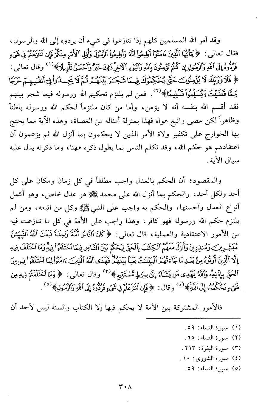 والمقصود؛ أن الحكم بالعدل واجب مطلقاً في كل زمان ومكان على كل أحد ولكل أحد، والحكم بما أنزل الله على محمد صلى الله عليه وسلم هو عدل خاص، وهو أكمل أنواع العدل وأحسنها، والحكم به واجب على النبي صلى الله عليه وسلم وكل من اتبعه، ومن لم يلتزم حكم الله ورسوله فهو كافر، وهذا واجب على الأمة في كل ما تنازعت فيه من الأمور الاعتقادية والعملية، قال تعالى: {كَانَ النَّاسُ أُمَّةً وَاحِدَةً فَبَعَثَ اللَّهُ النَّبِيِّينَ مُبَشِّرِينَ وَمُنْذِرِينَ وَأَنْزَلَ مَعَهُمُ الْكِتَابَ بِالْحَقِّ لِيَحْكُمَ بَيْنَ النَّاسِ فِيمَا اخْتَلَفُوا فِيهِ وَمَا اخْتَلَفَ فِيهِ إِلَّا الَّذِينَ أُوتُوهُ مِنْ بَعْدِ مَا جَاءَتْهُمُ الْبَيِّنَاتُ بَغْياً بَيْنَهُمْ فَهَدَى اللَّهُ الَّذِينَ آمَنُوا لِمَا اخْتَلَفُوا فِيهِ مِنَ الْحَقِّ بِإِذْنِهِ وَاللَّهُ يَهْدِي مَنْ يَشَاءُ إِلَى صِرَاطٍ مُسْتَقِيمٍ} 3 وقال تعالى: {وَمَا اخْتَلَفْتُمْ فِيهِ مِنْ شَيْءٍ فَحُكْمُهُ إِلَى اللَّهِ} 4 وقال: {فَإِنْ تَنَازَعْتُمْ فِي شَيْءٍ فَرُدُّوهُ إِلَى اللَّهِ وَالرَّسُولِ} 5.