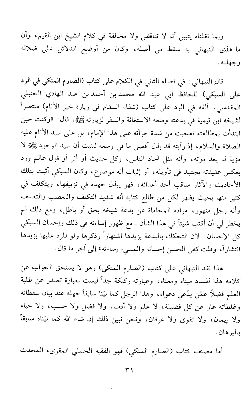 قال النبهاني. في فصله الثاني في الكلام على كتاب "الصارم المنكي في الرد على السبكي" للحافظ أبي عبد الله محمد بن أحمد بن عبد الهادي الحنبلي المقدسي، ألفه في الرد على كتاب "شفاء السقام في زيارة خير الأنام" منتصراً لشيخه ابن تيمية في بدعته ومنعه الاستغاثة والسفر لزيارته صلى الله عليه وسلم، قال: "وكنت حين ابتدأت بمطالعته تعجبت من شدة جرأته على هذا الإمام، بل على سيد الأنام عليه الصلاة والسلام، إذ رأيته قد بذل أقصى ما في وسعه ليثبت أن سيد الوجود صلى الله عليه وسلم لا مزية له بعد موته، وأنه مثل أحاد الناس، وكل حديث أو أثر أو قول عالم ورد بعكس عقيدته يجتهد في تأويله، أو إثبات أنه موضوع، وكان السبكي أثبت بتلك الأحاديث والآثار مناقب أحد أعدائه، فهو يبذل جهده في تزييفها، ويتكلف في كثير منها بحيث يظهر لكل من طالع كتابه أنه شديد التكلف والتعصب والتعسف وأنه رجل متهور، مراده المحاماة عن بدعة شيخه بحق أو باطل، ومع ذلك لم يخطر لي أن أكتب شيئاً في هذا الشأن- مع ظهور إساءته في ذلك وإحسان السبكي كل الإحسان لأن التحكك بالبدعة يزيدها اشتهاراً وذكرها ولو للرد عليها يزيدها انتشاراً، وقلت كفى الحسن إحسانه والمسيء إساءته" إلى آخر ما قال.